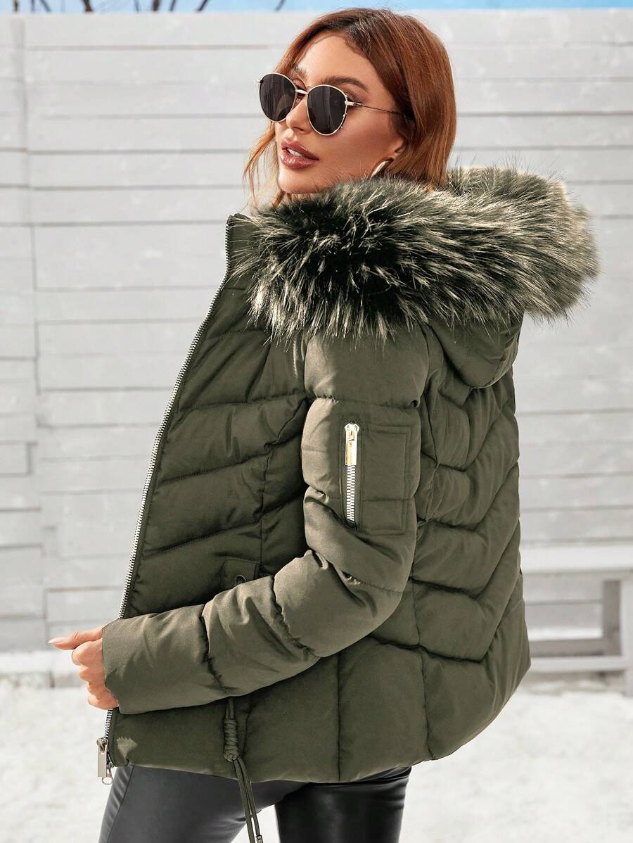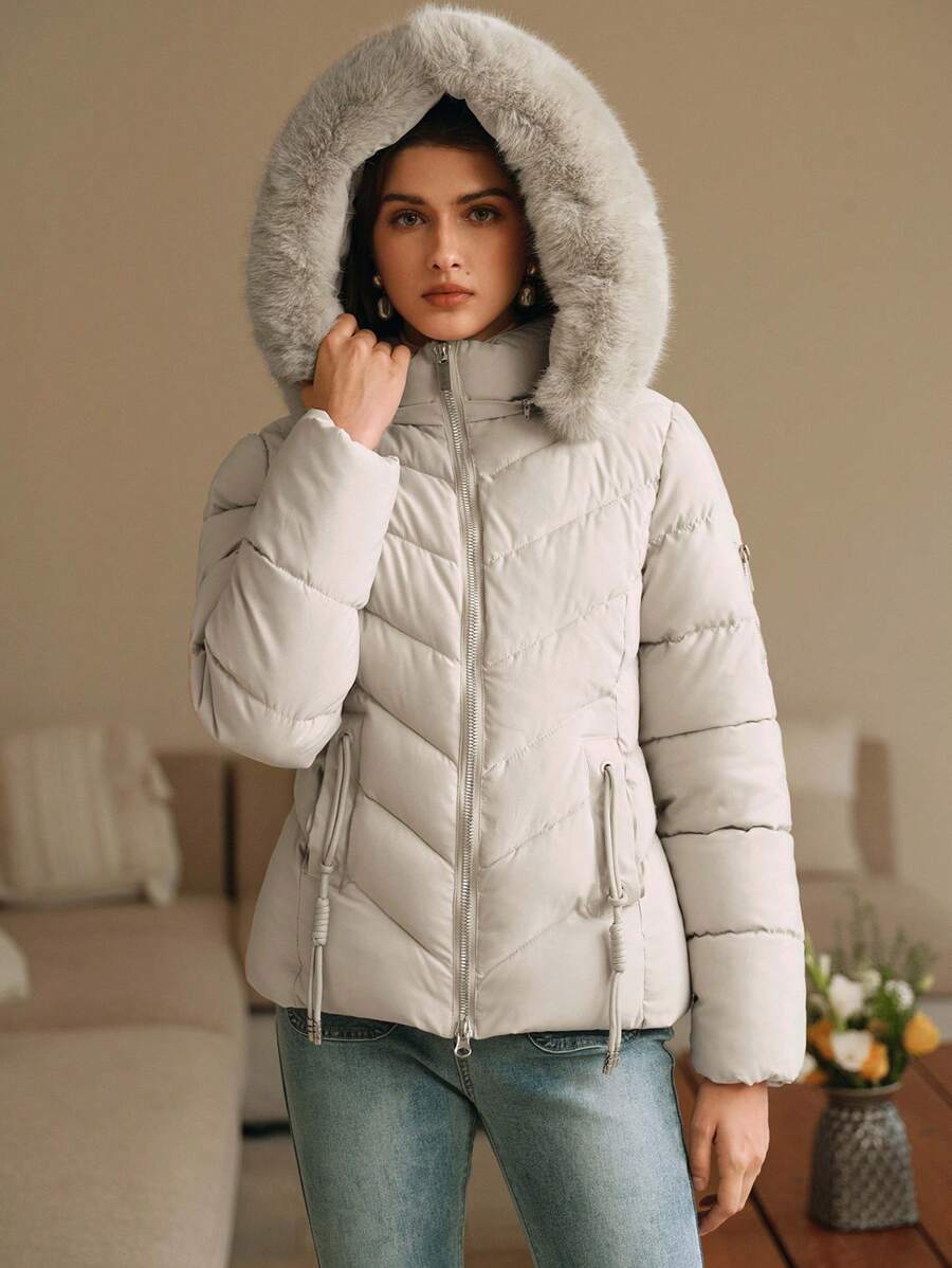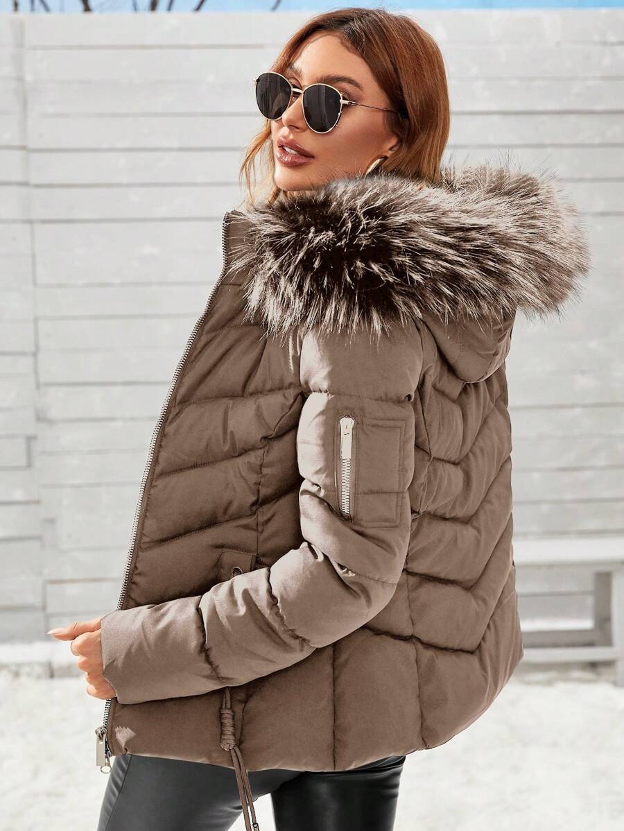 Cappotto imbottito invernale da donna con cappuccio in pelliccia, colletto con zip, manica lunga, in tinta unita