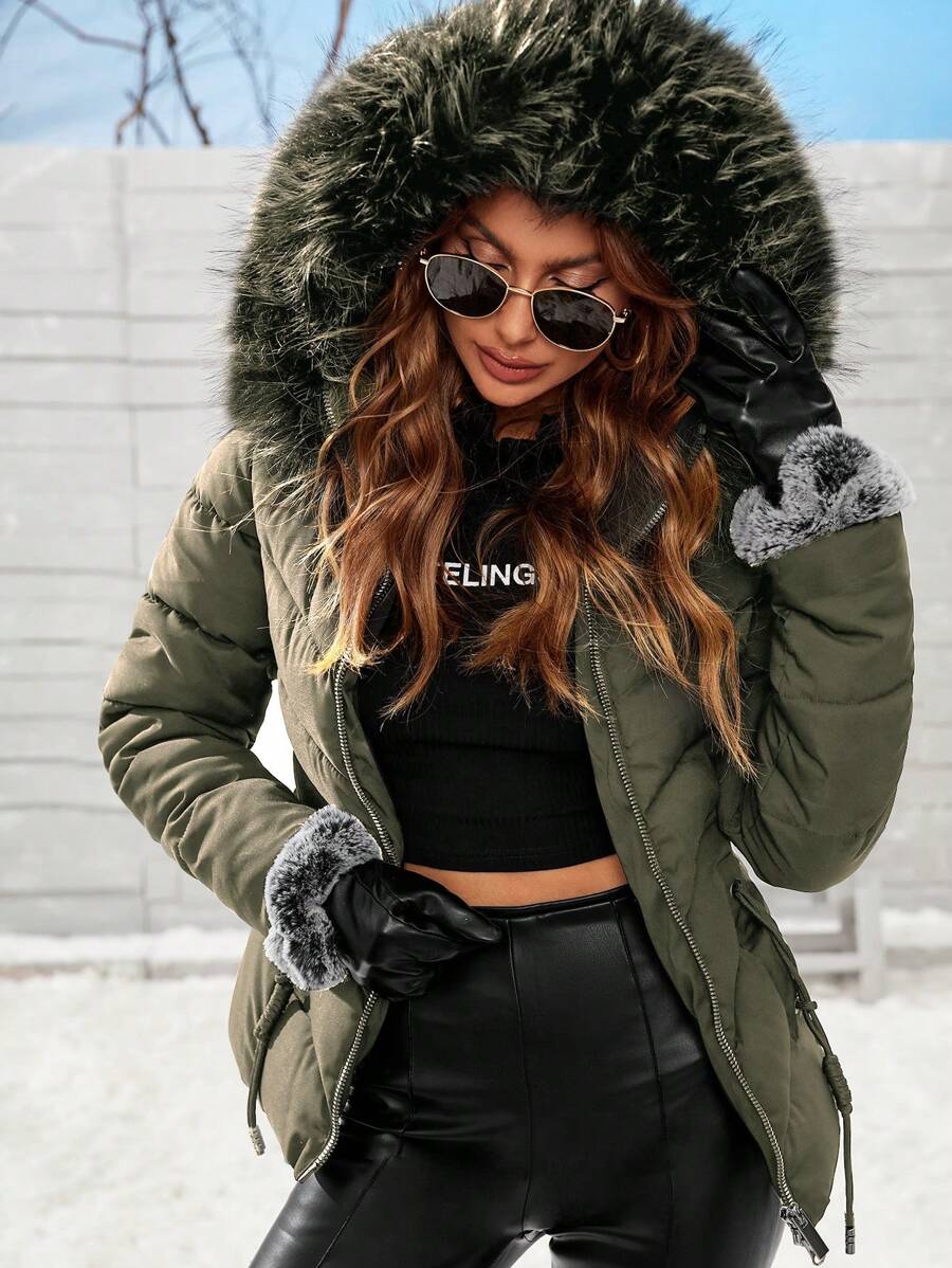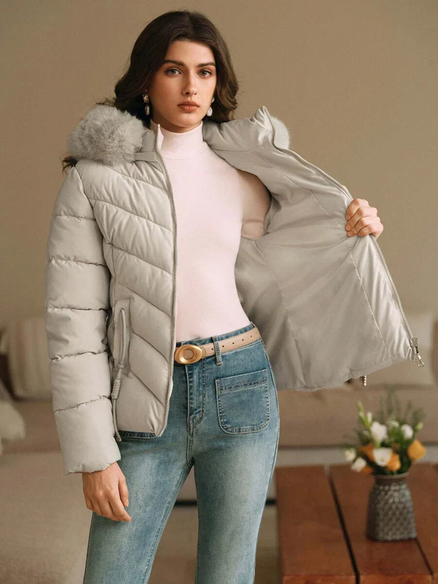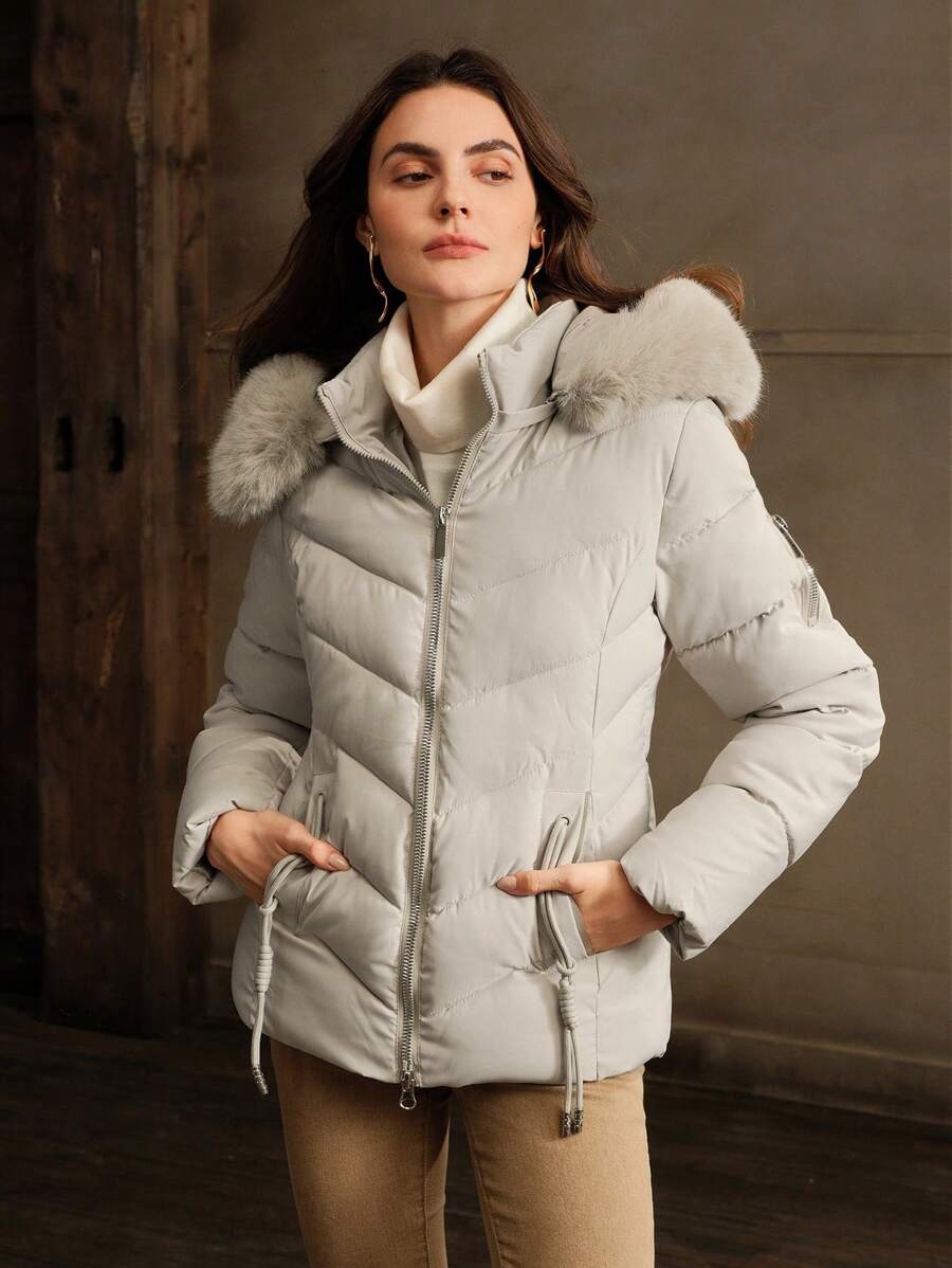 Cappotto imbottito invernale da donna con cappuccio in pelliccia, colletto con zip, manica lunga, in tinta unita