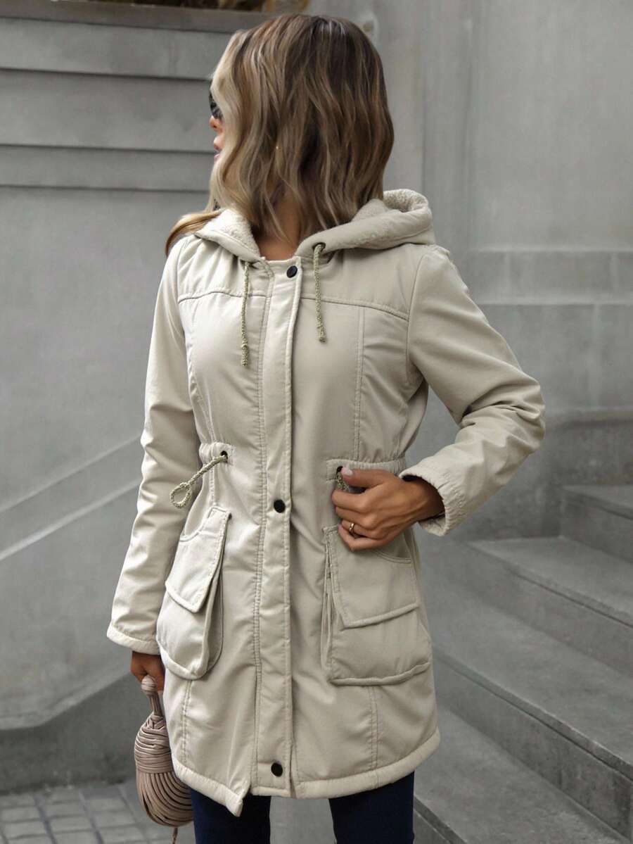 Cappotto invernale alla moda, ampio e casual, con cappuccio, con chiusura lampo e coulisse in vita, imbottito