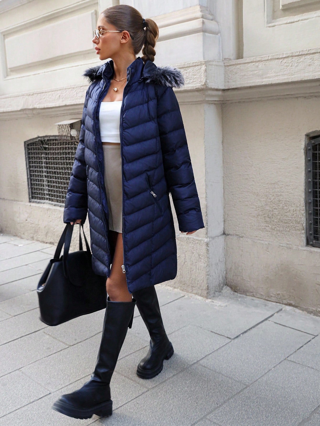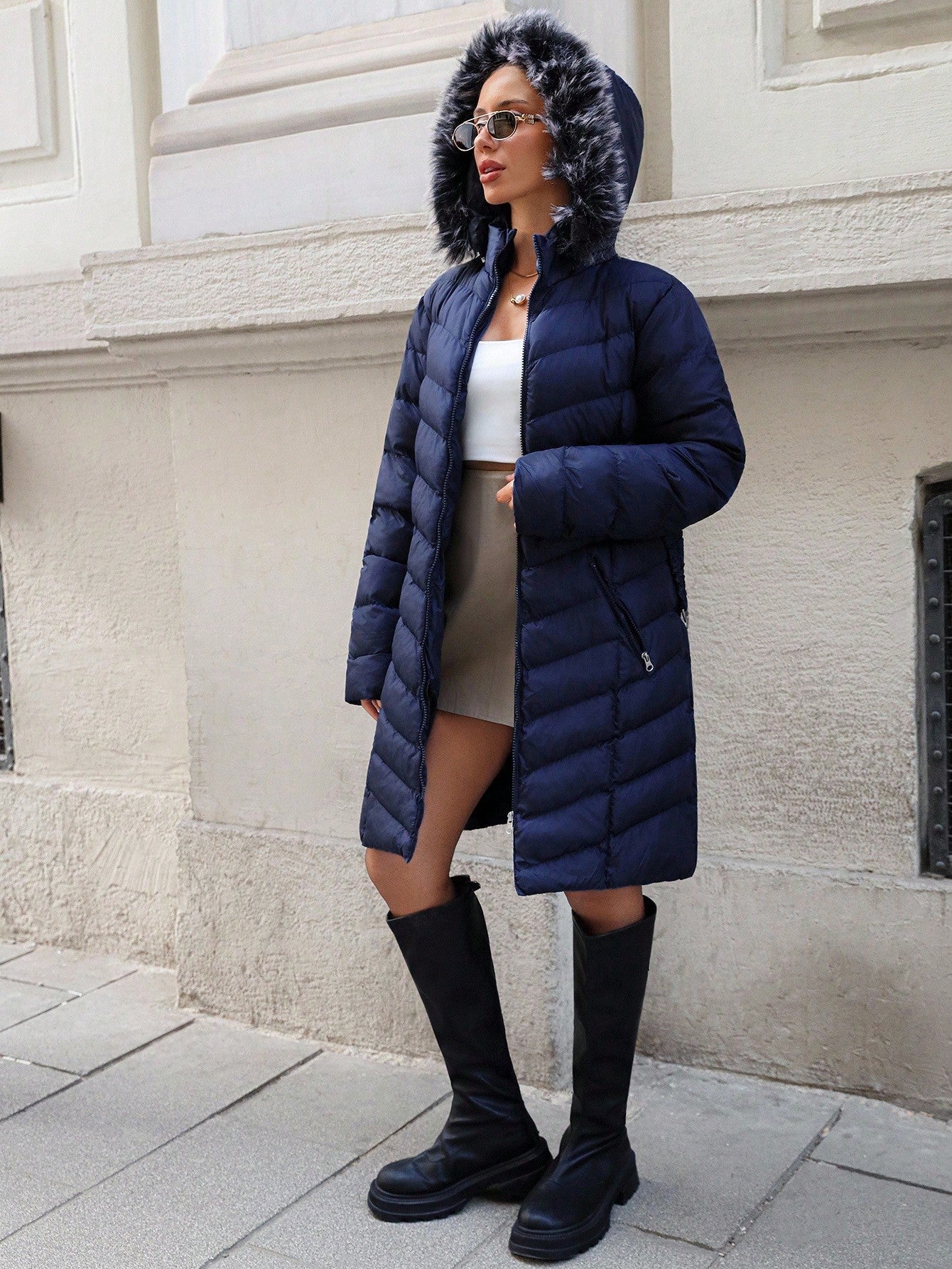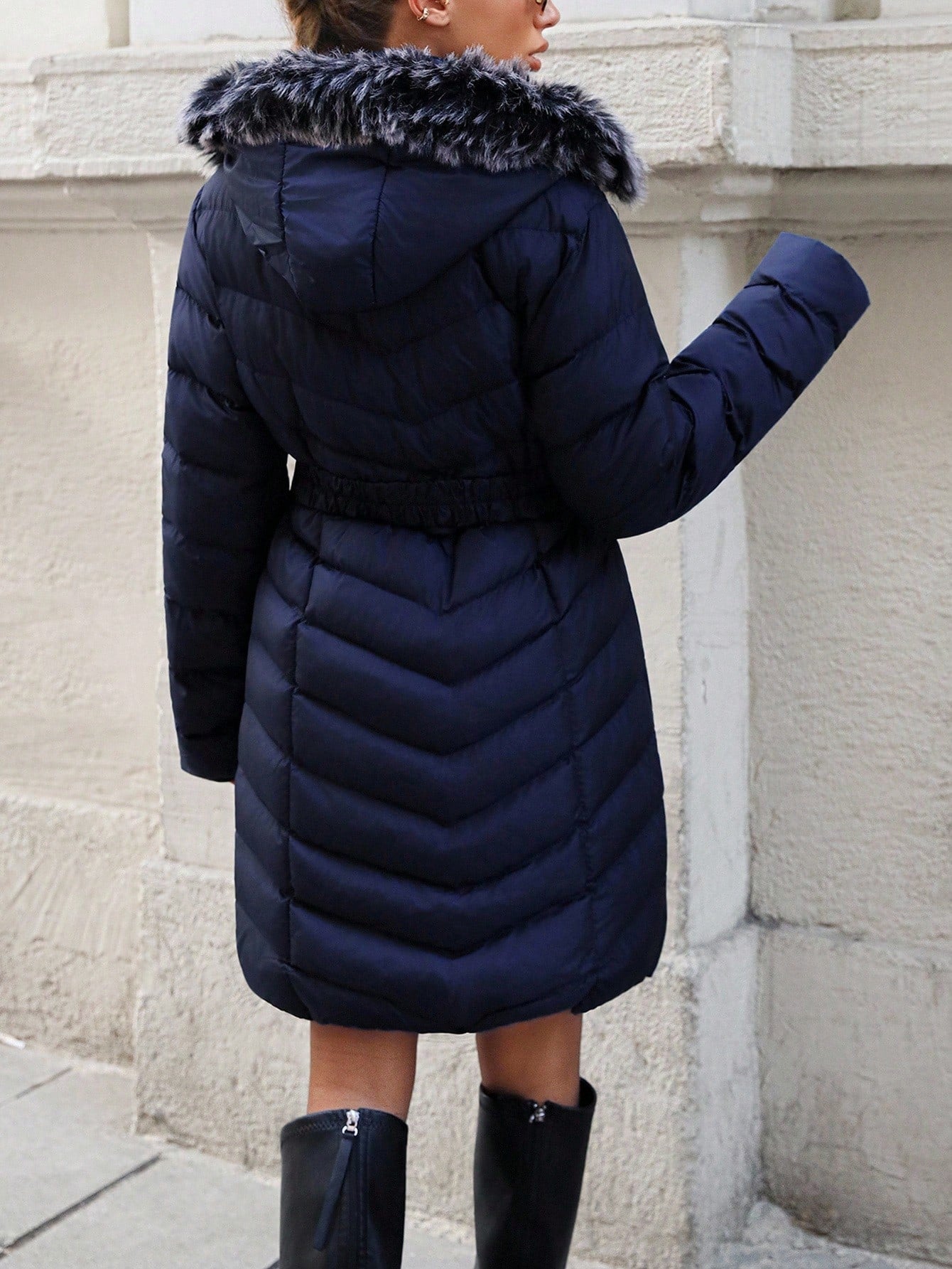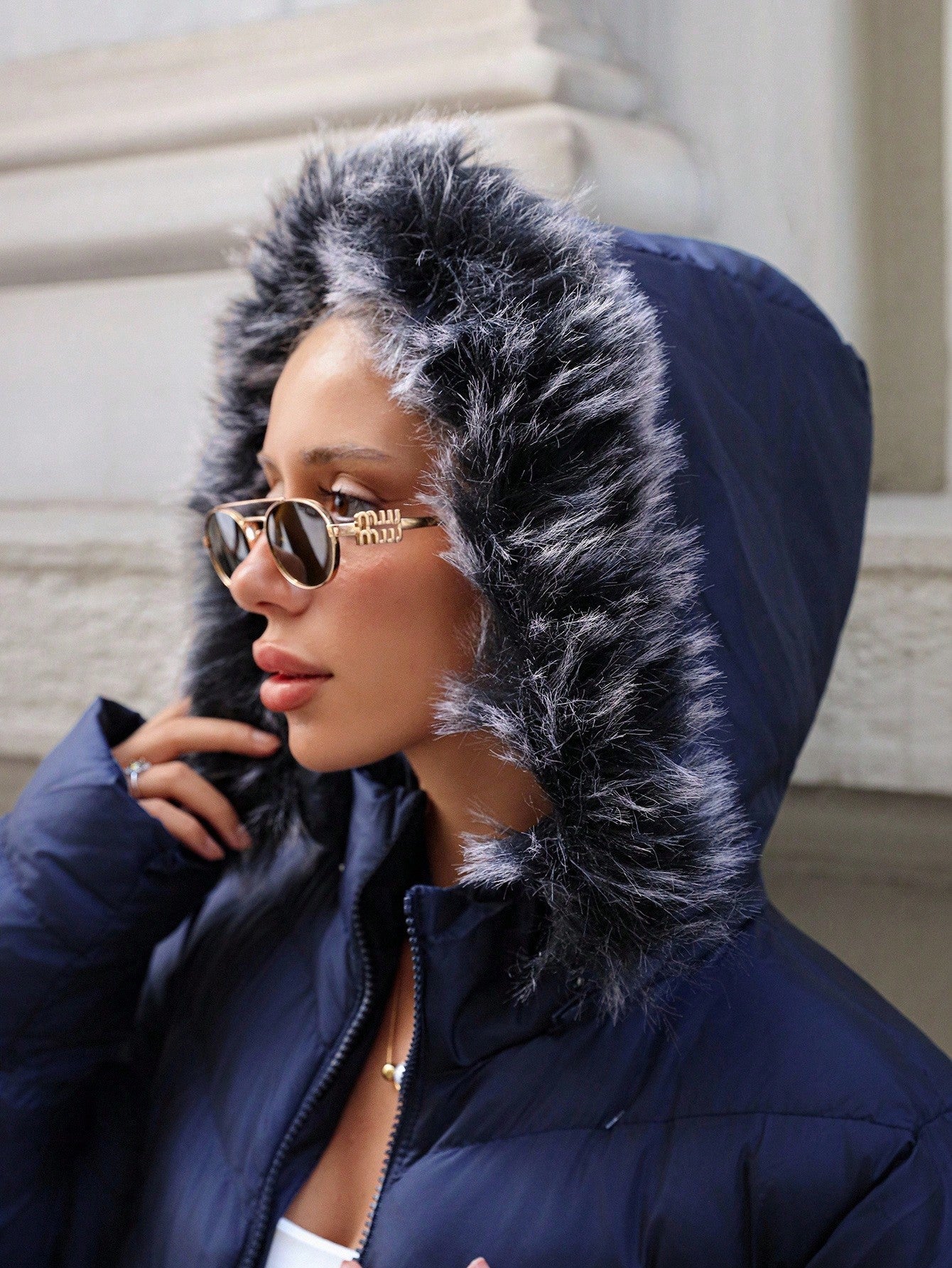 Giacca casual invernale da donna con cappuccio in pelliccia sintetica, colore tinta unita, con patchwork