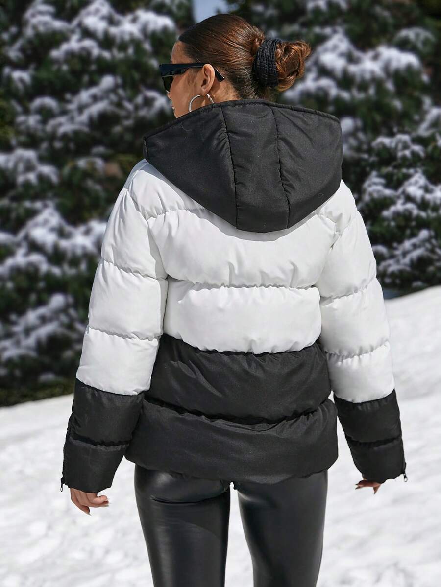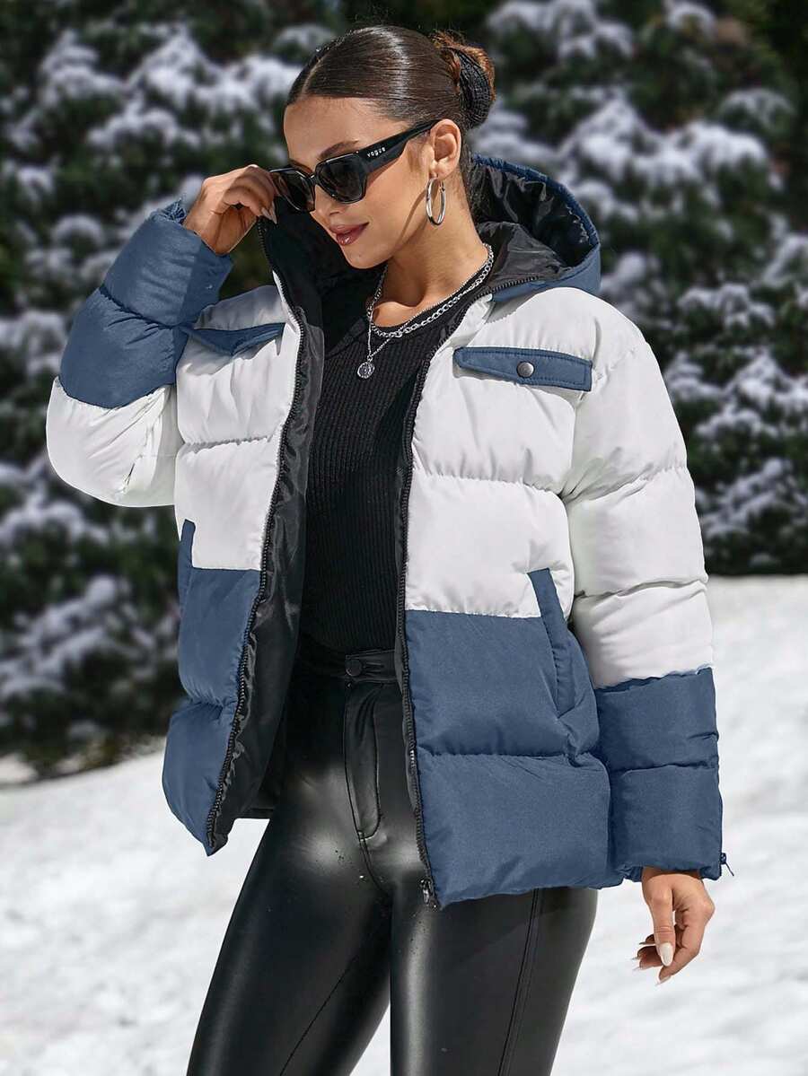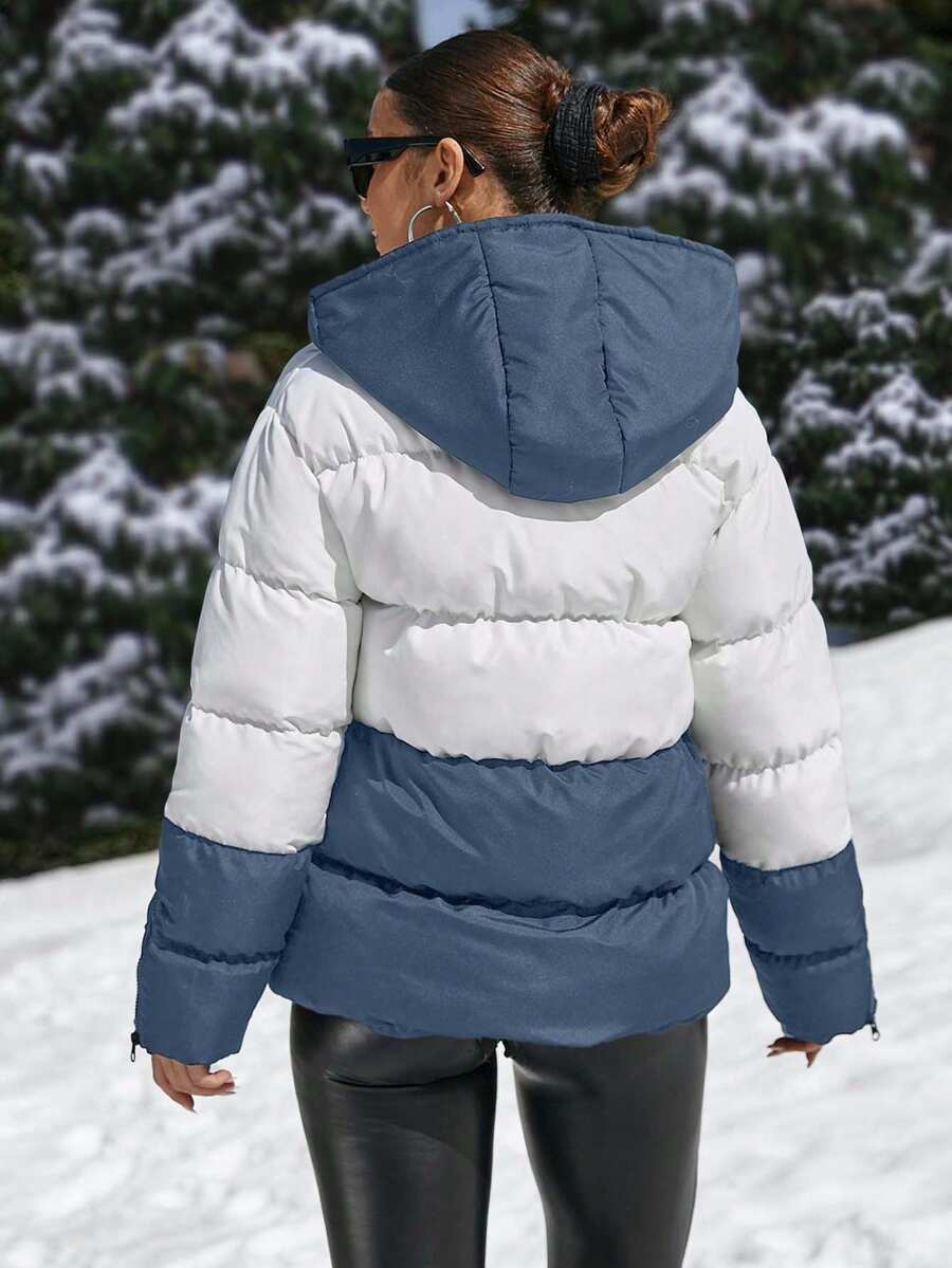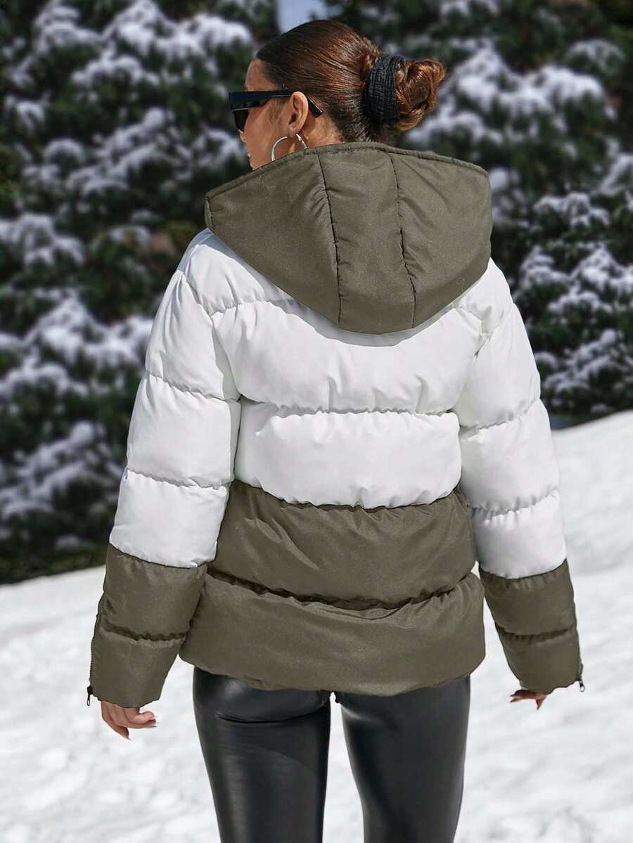 Giacca imbottita con cappuccio a contrasto di colore, maniche lunghe e tasche, effetto patchwork