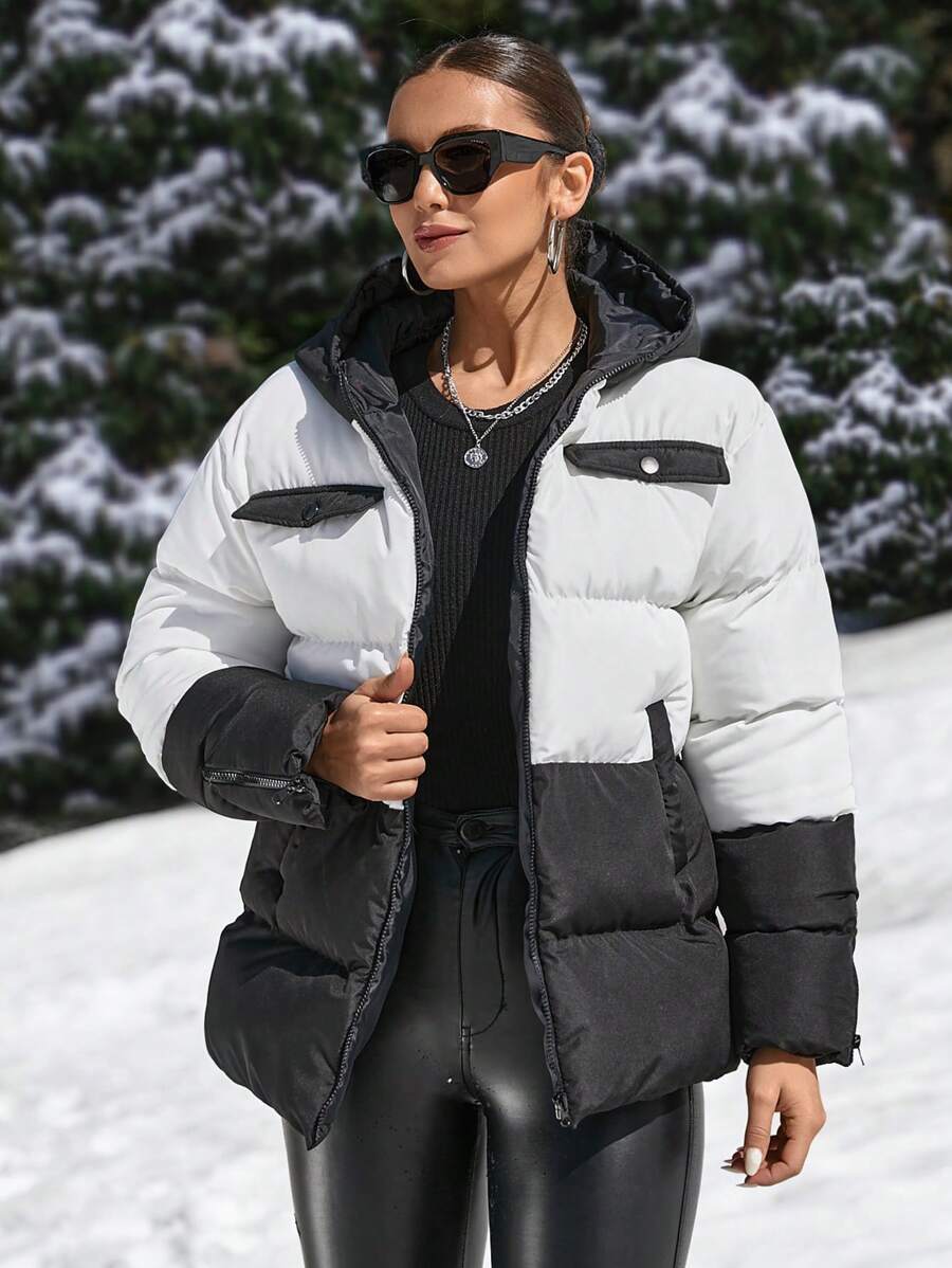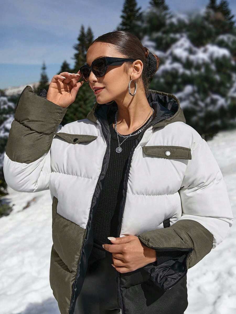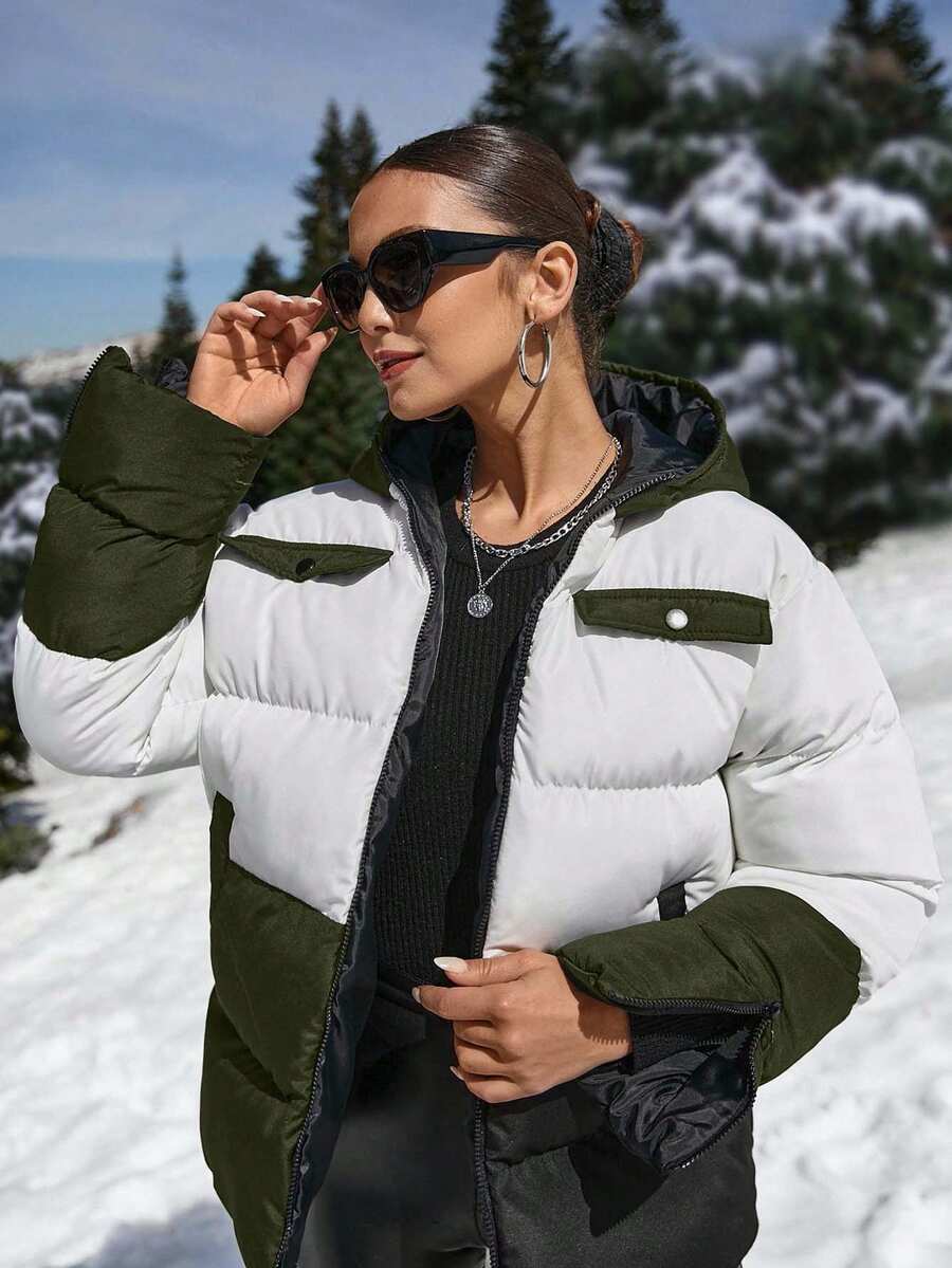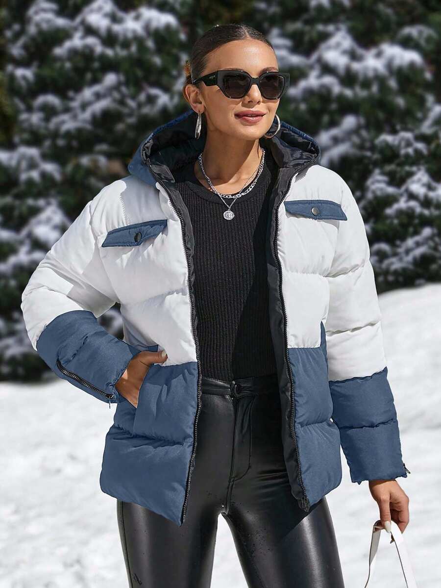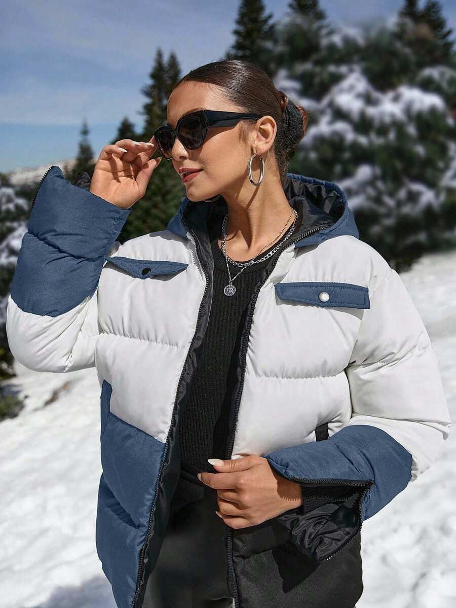 Giacca imbottita con cappuccio a contrasto di colore, maniche lunghe e tasche, effetto patchwork