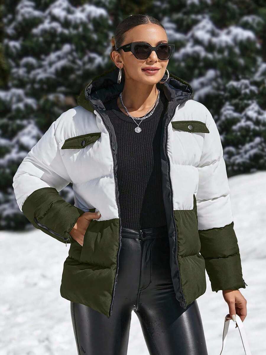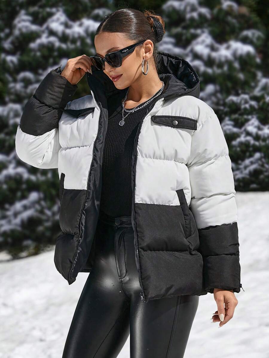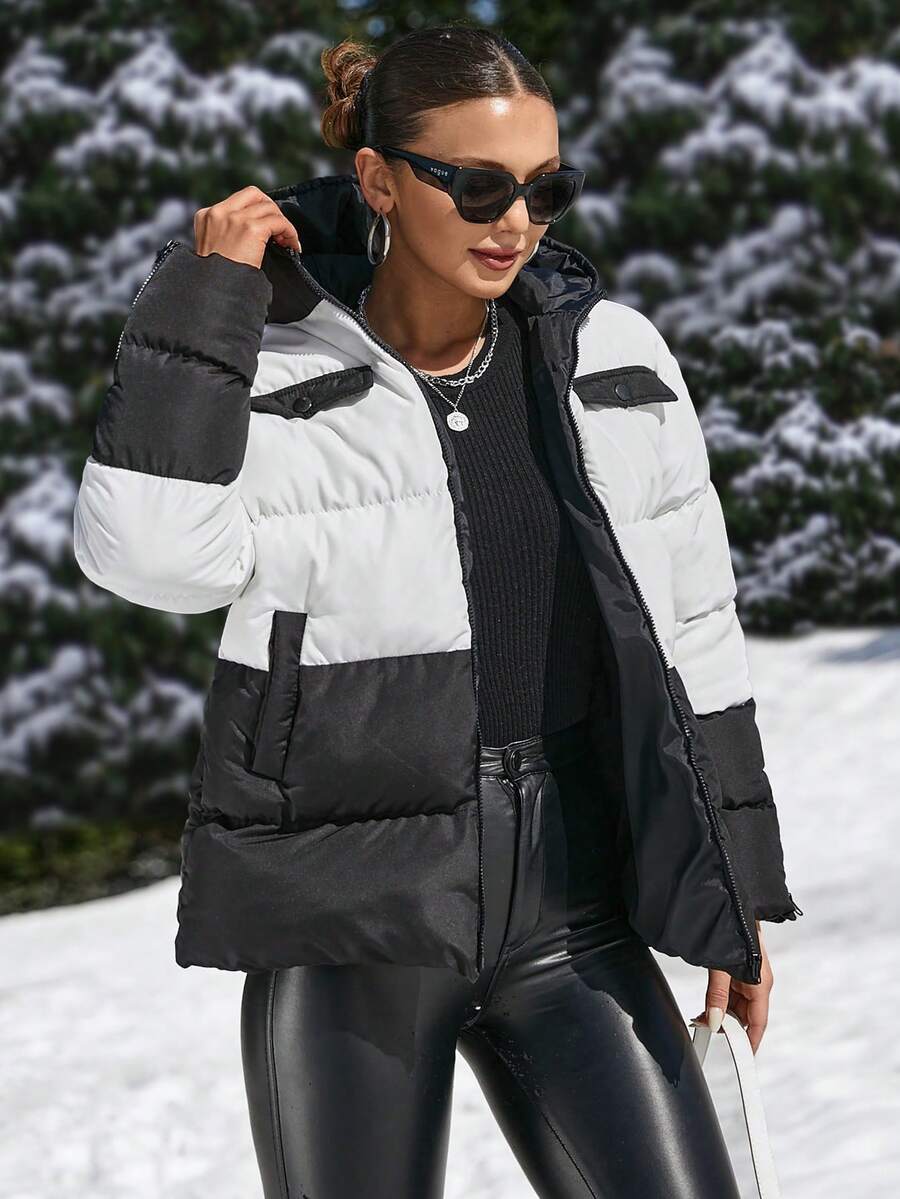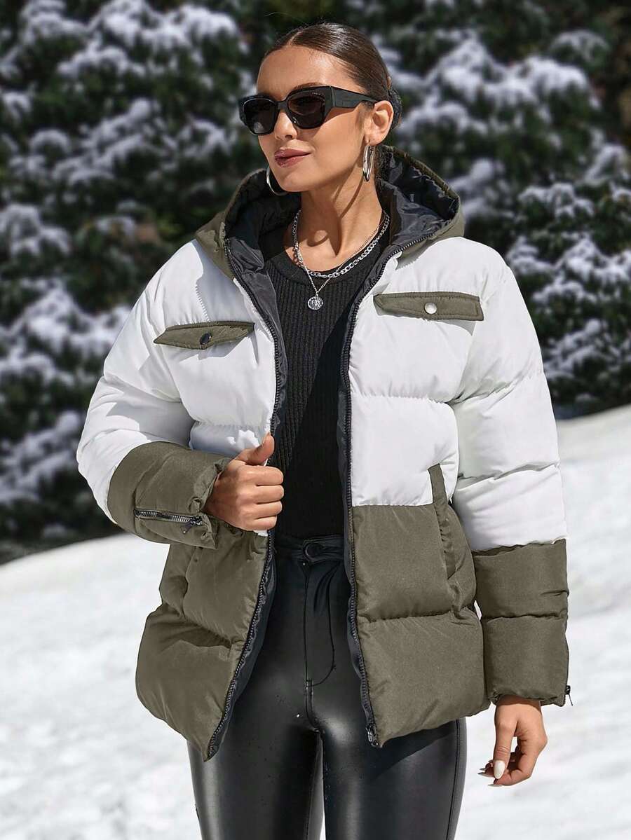 Giacca imbottita con cappuccio a contrasto di colore, maniche lunghe e tasche, effetto patchwork