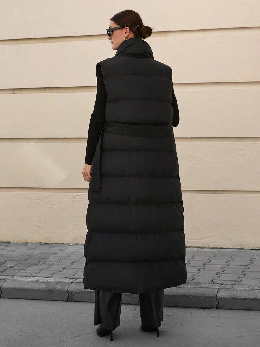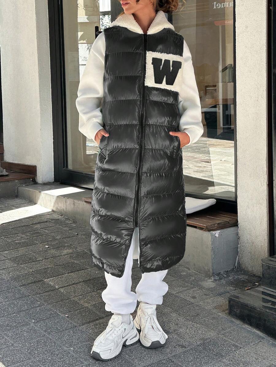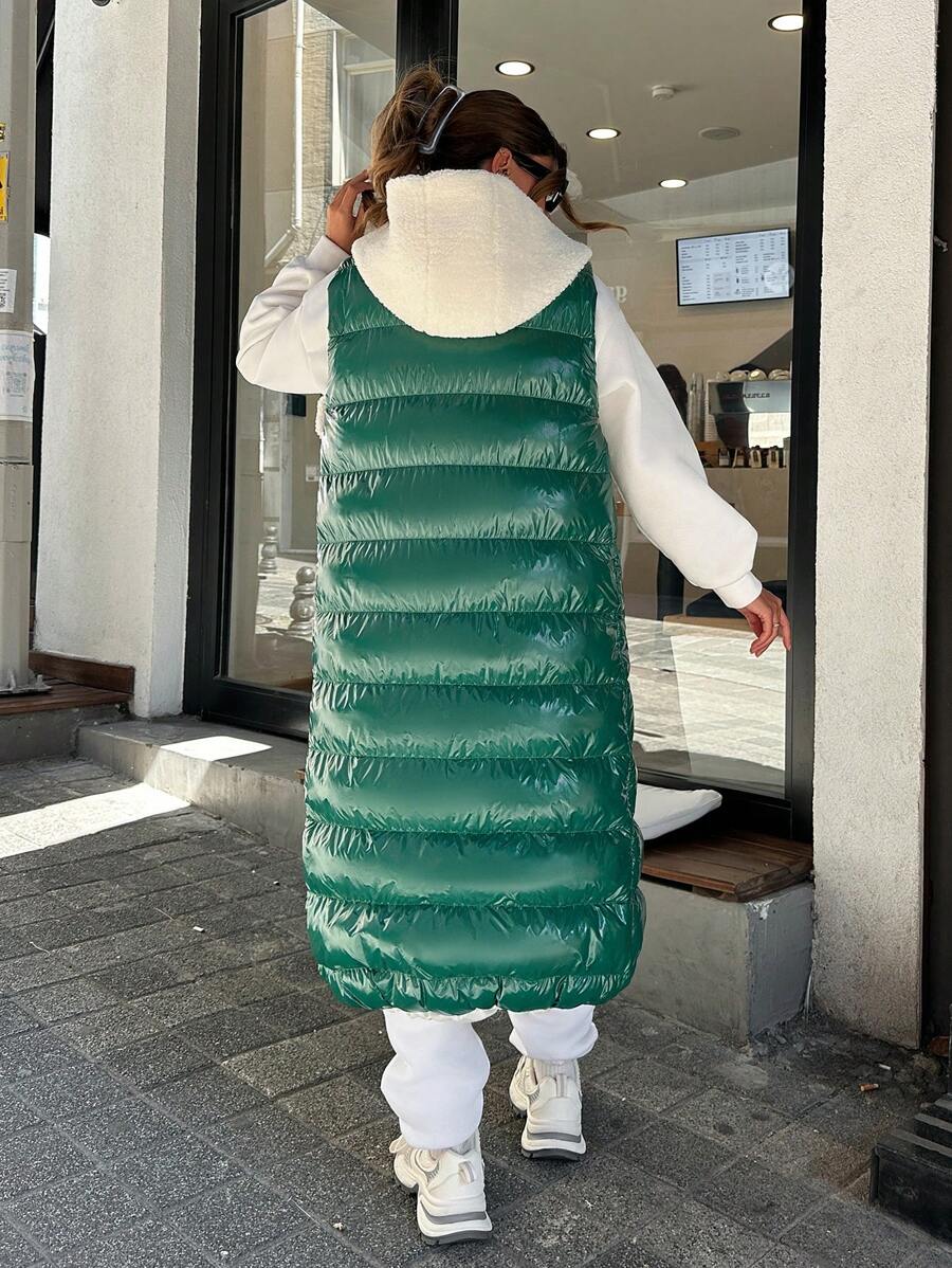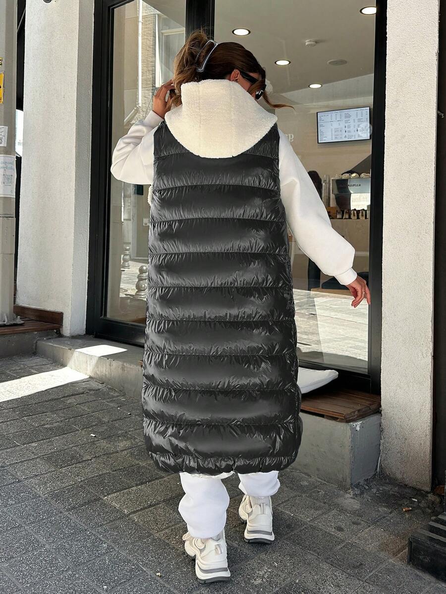 Gilet imbottito lungo senza maniche con cappuccio monocolore