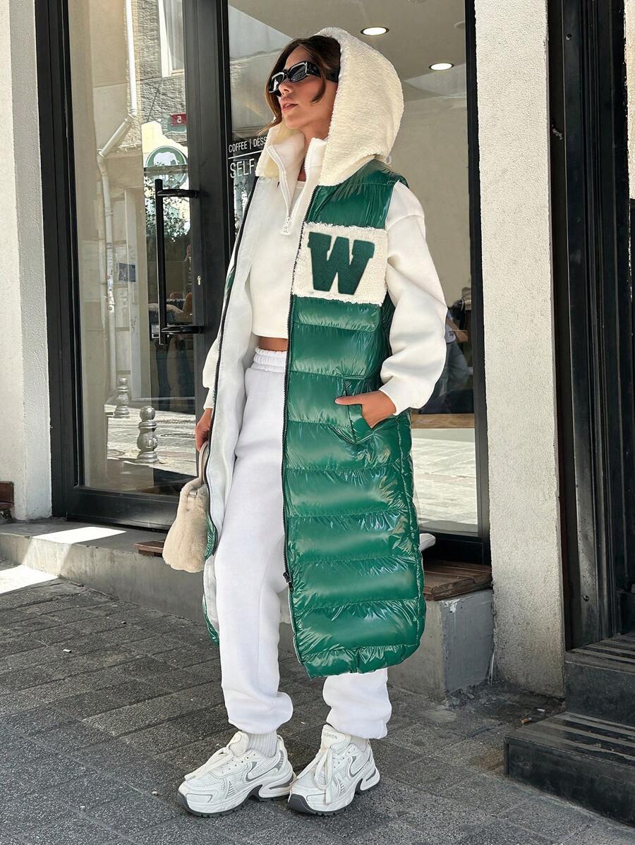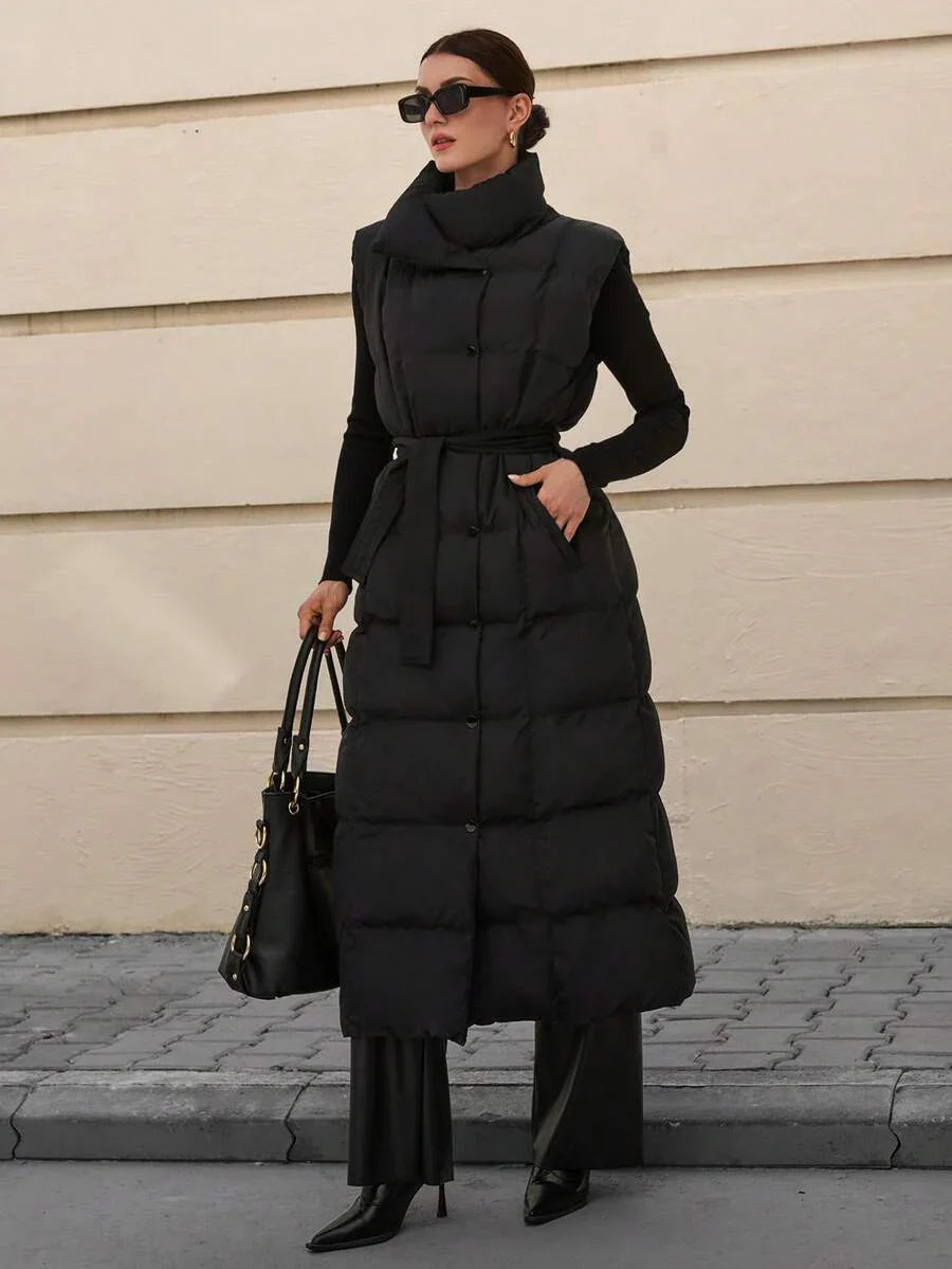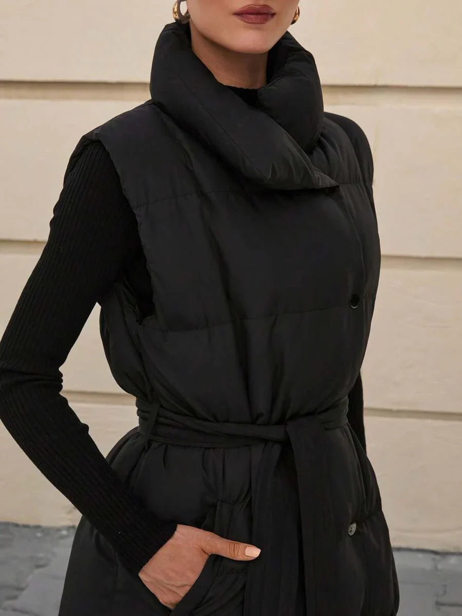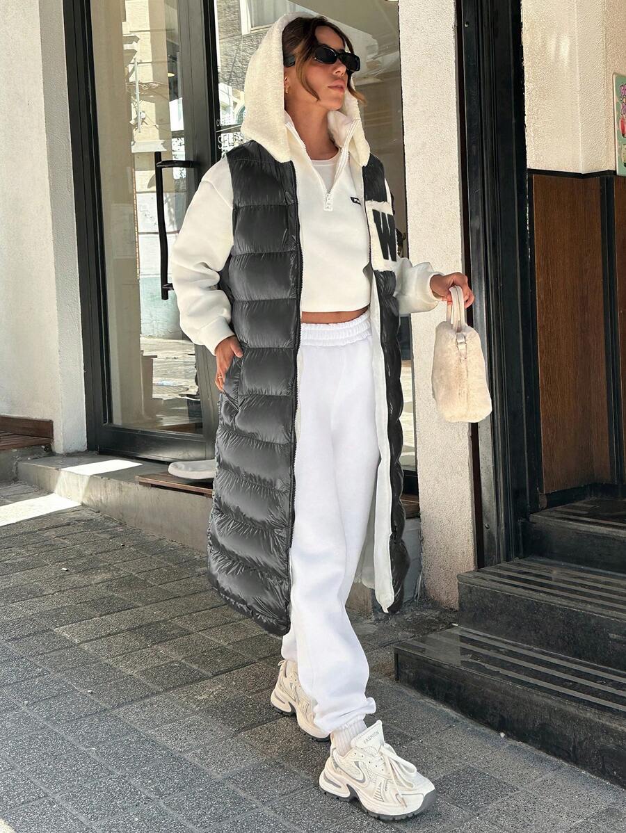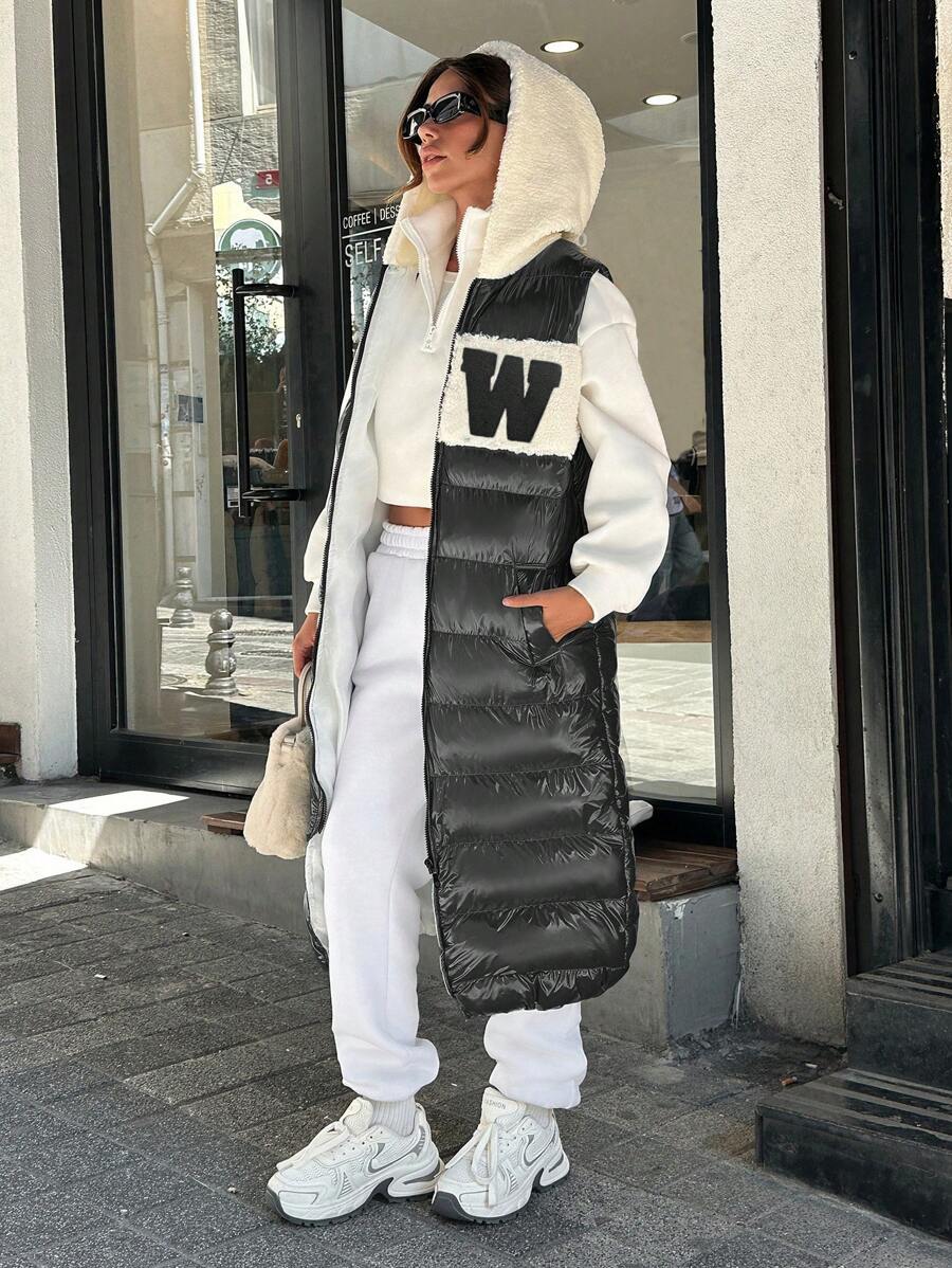 Gilet imbottito lungo senza maniche con cappuccio monocolore