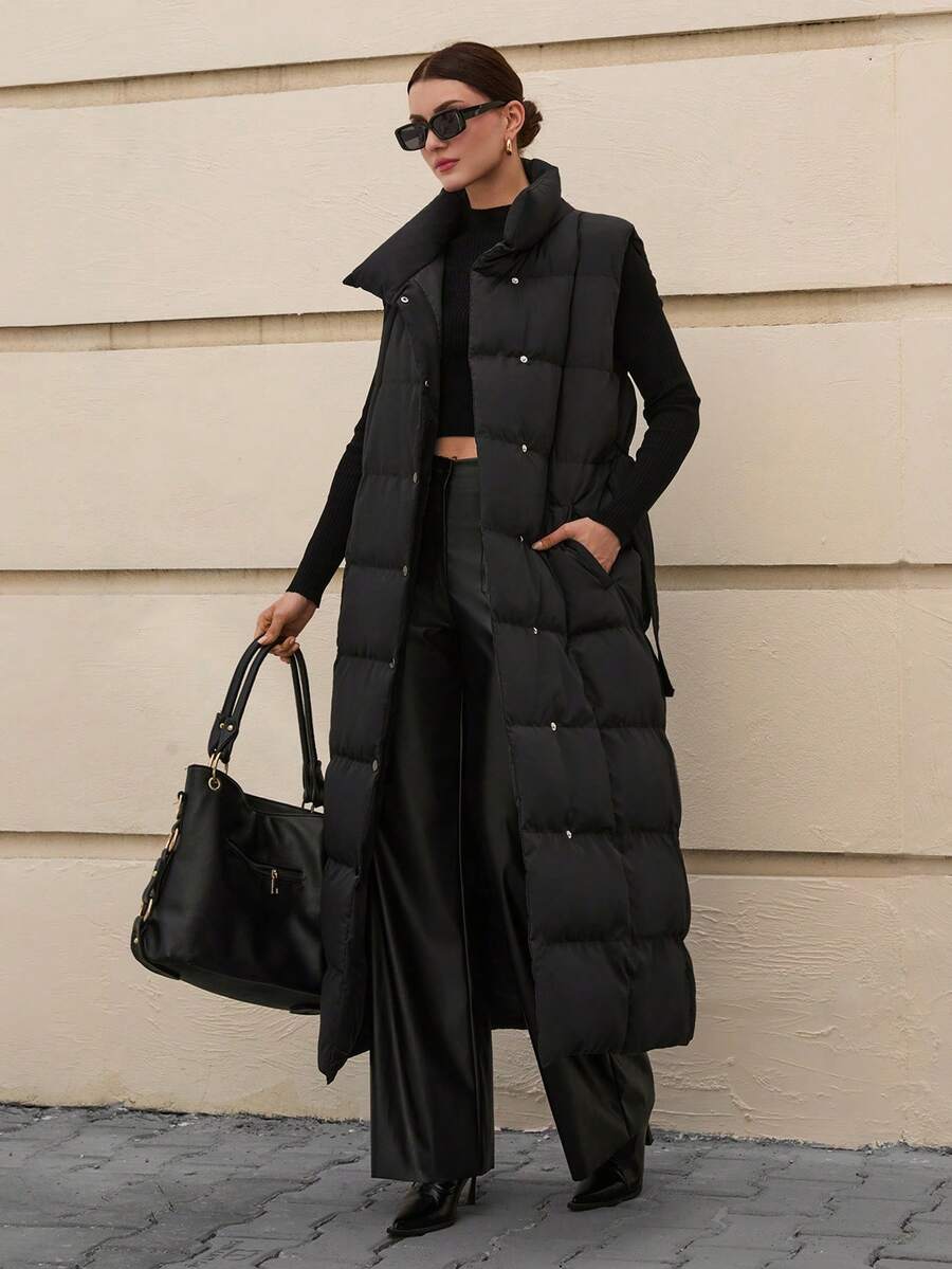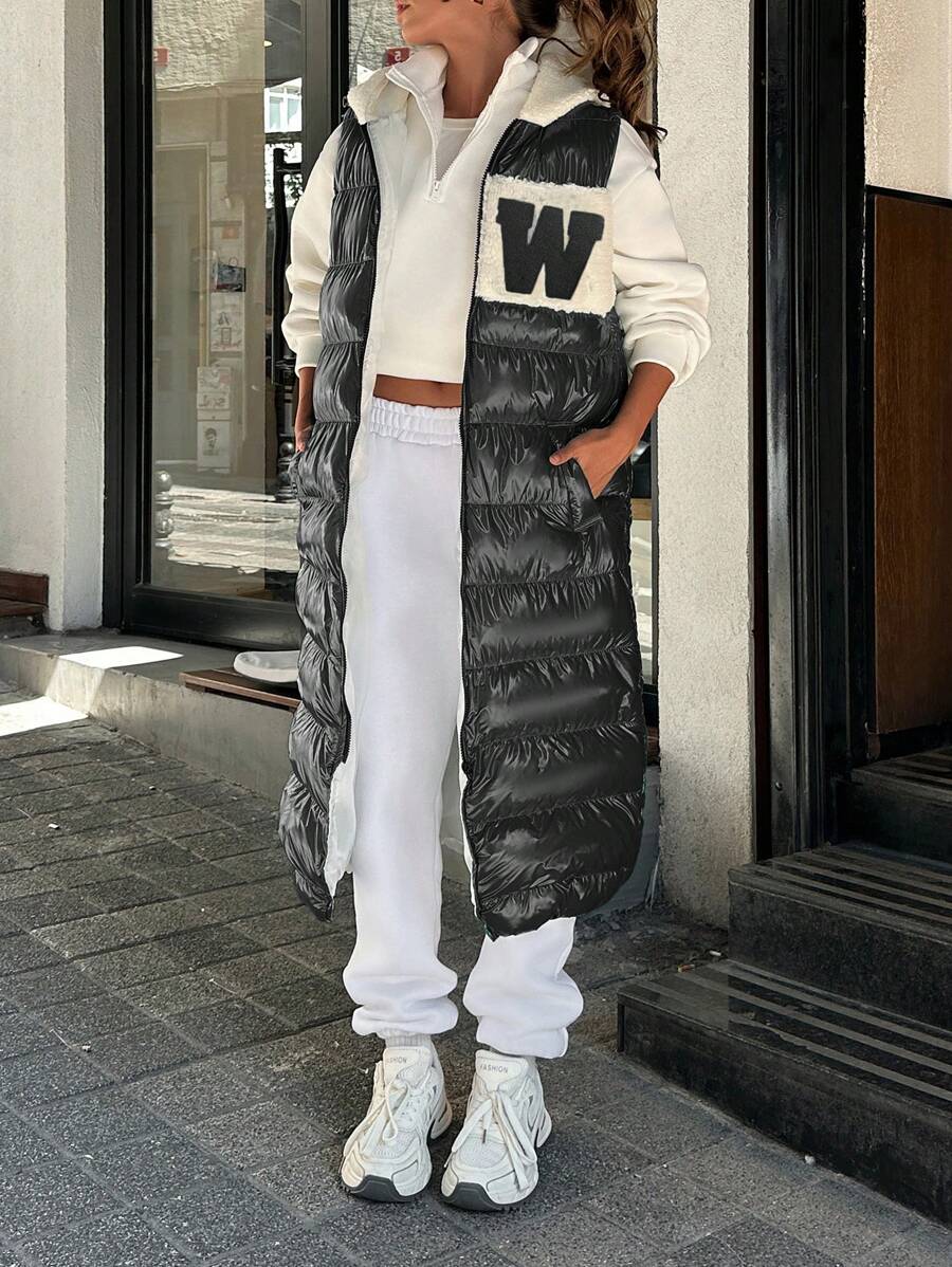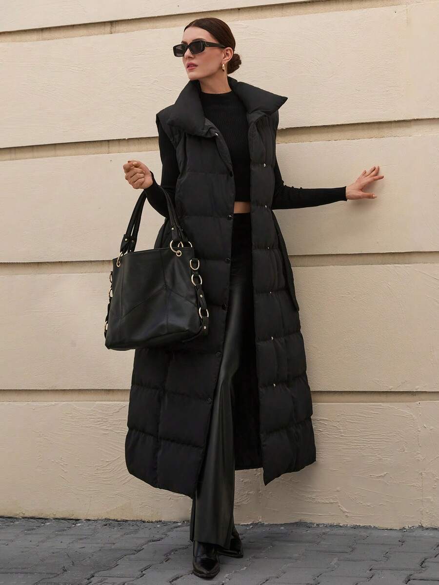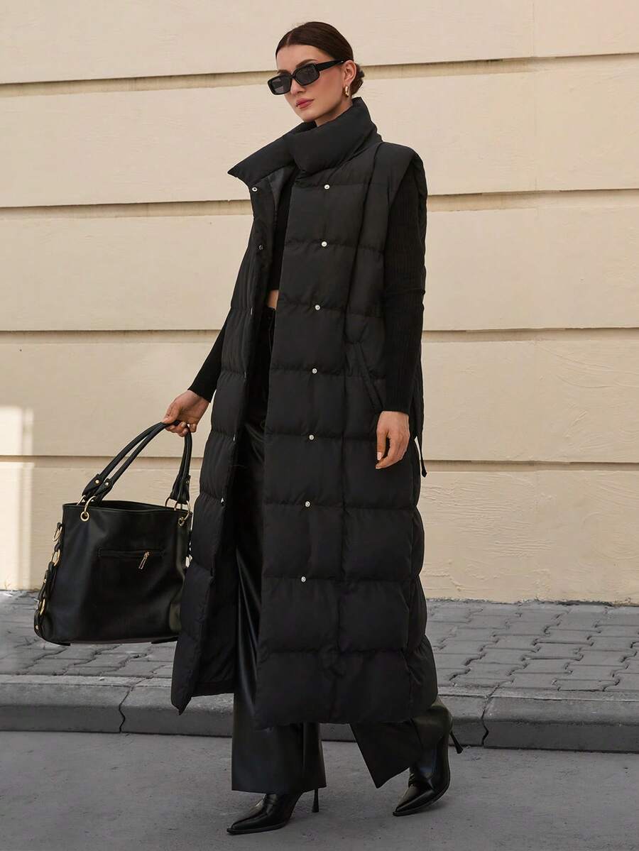 Gilet imbottito lungo senza maniche con cappuccio monocolore