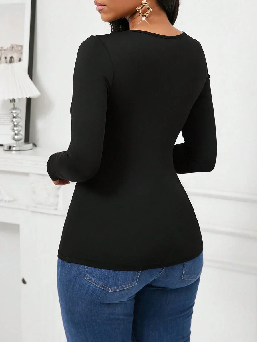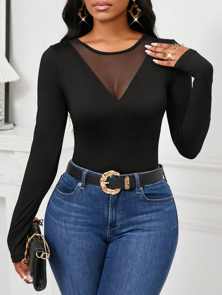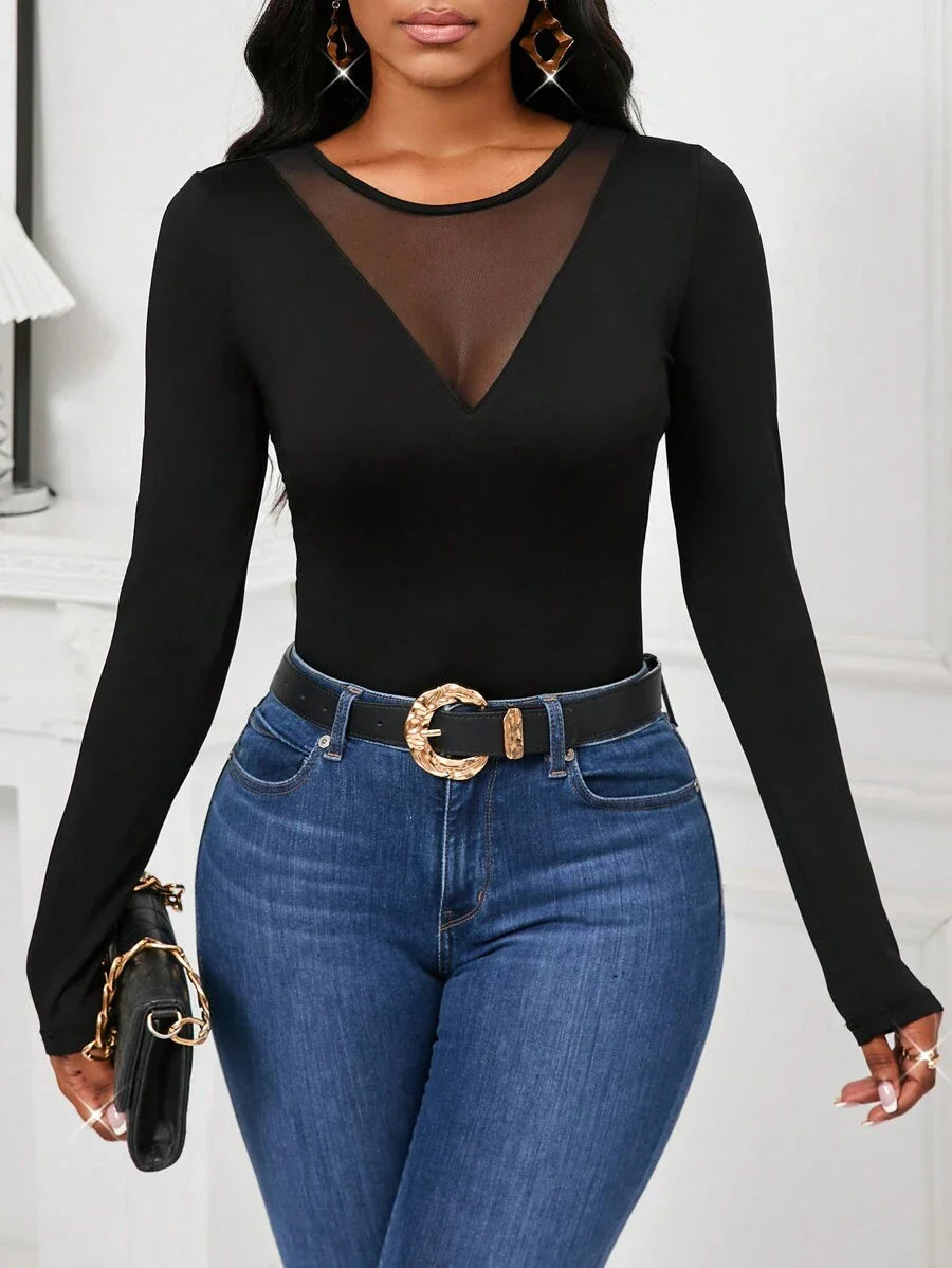 Maglietta a maniche lunghe elegante da donna in autunno, con inserti in rete e aderente