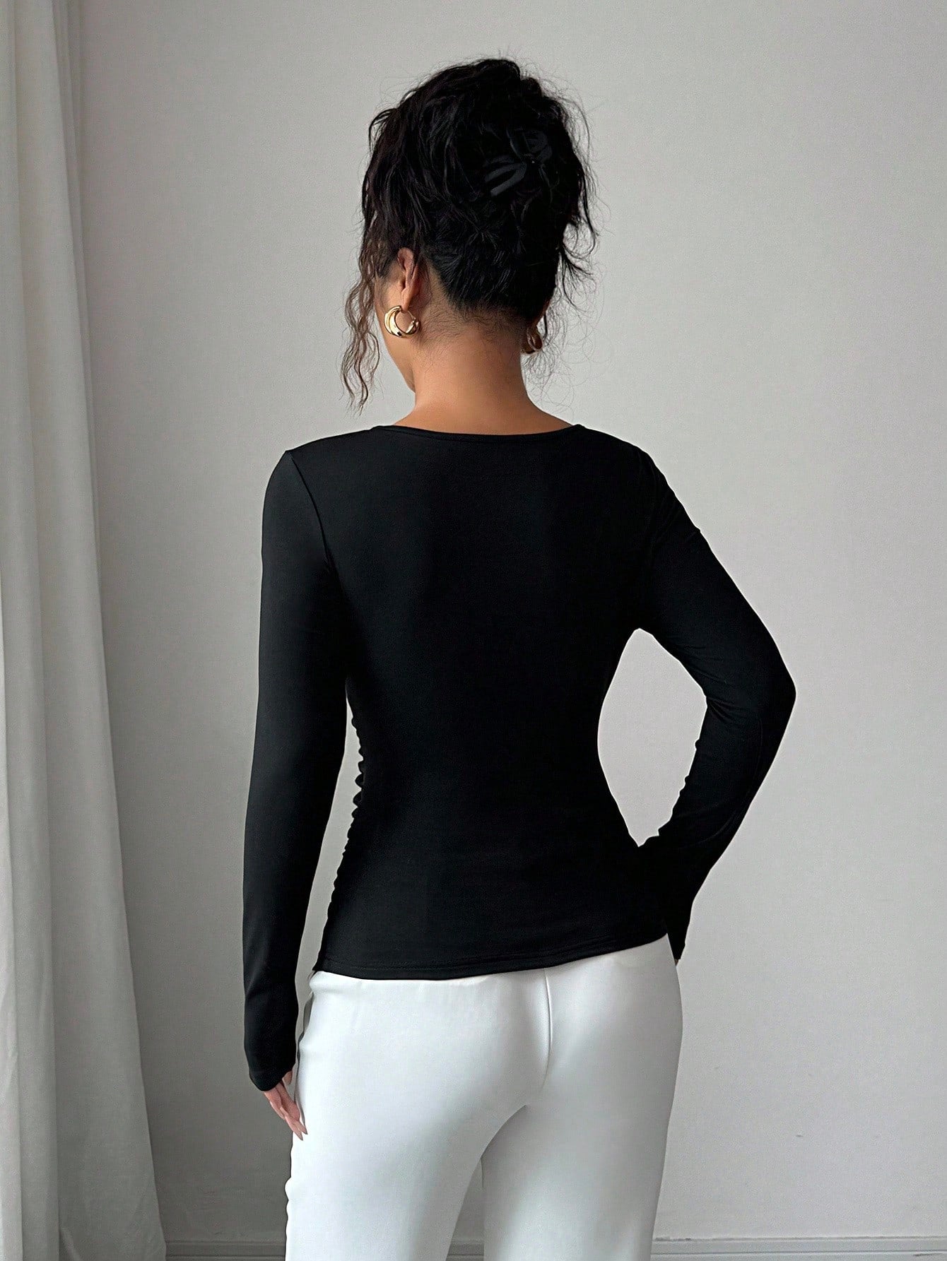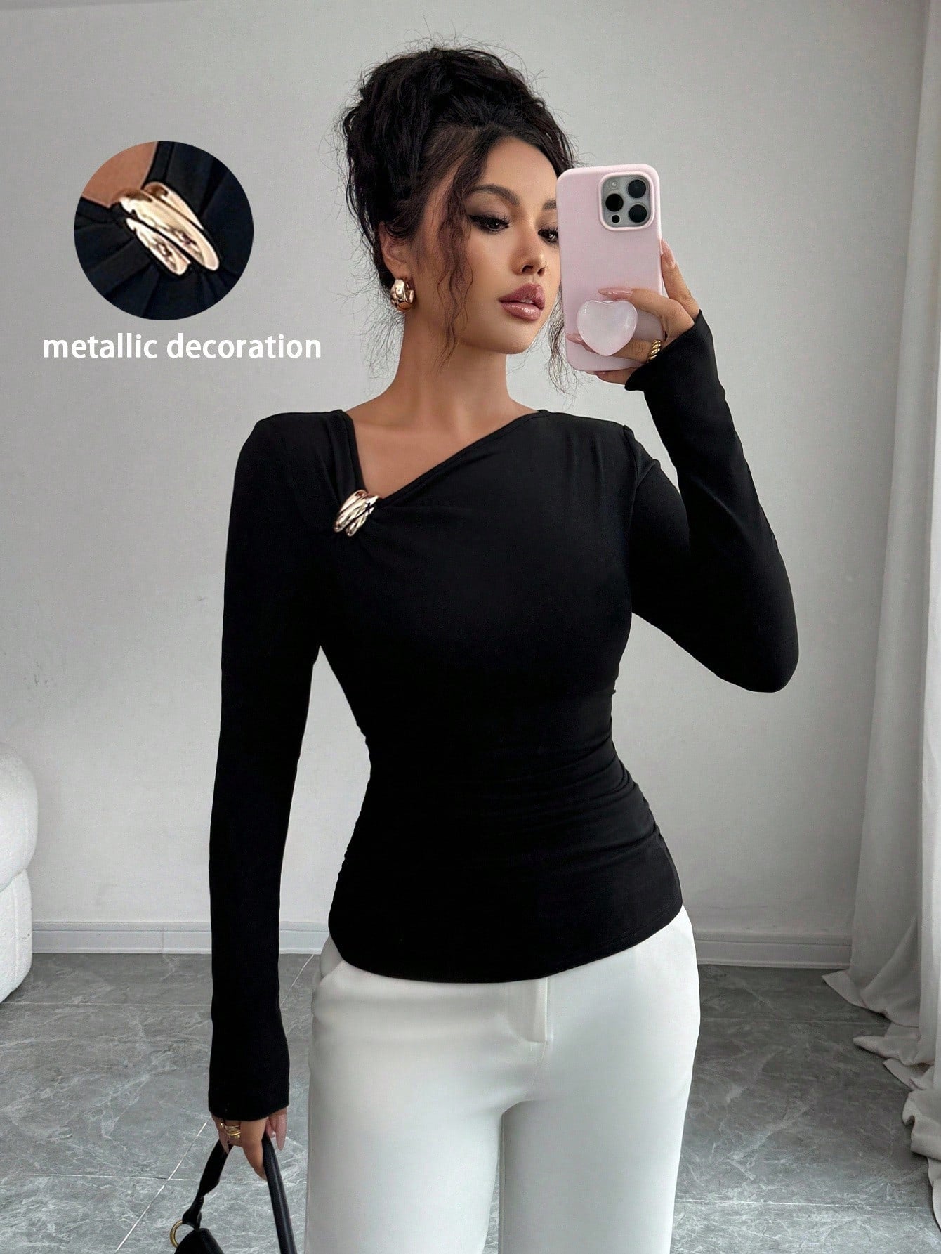 Maglietta da donna alla moda per pendolari, con colletto asimmetrico e decorazione in metallo, di colore unito