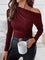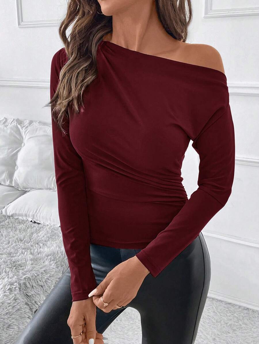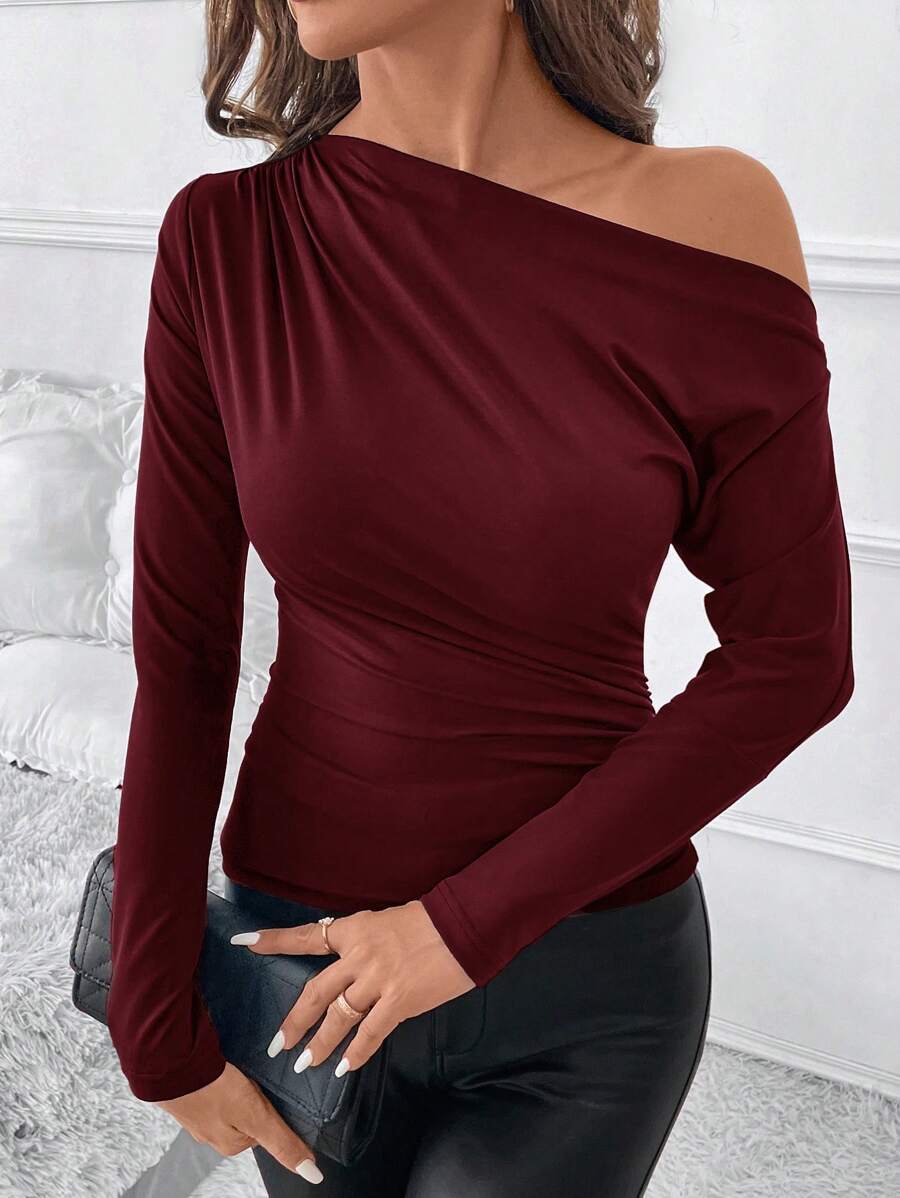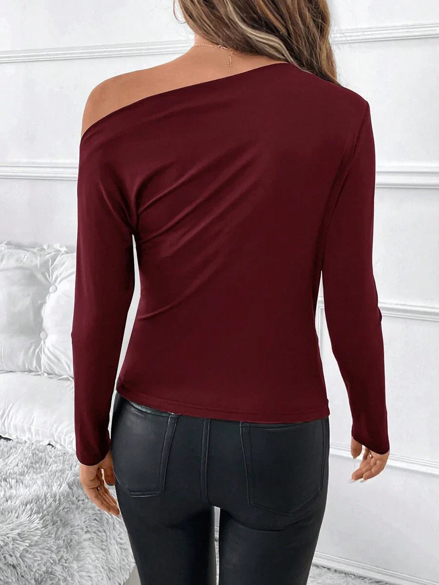 Maglietta elegante a maniche lunghe con scollo asimmetrico e volant, a tinta unita