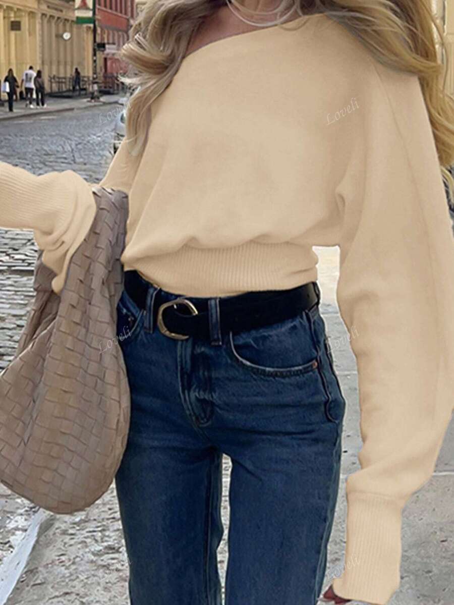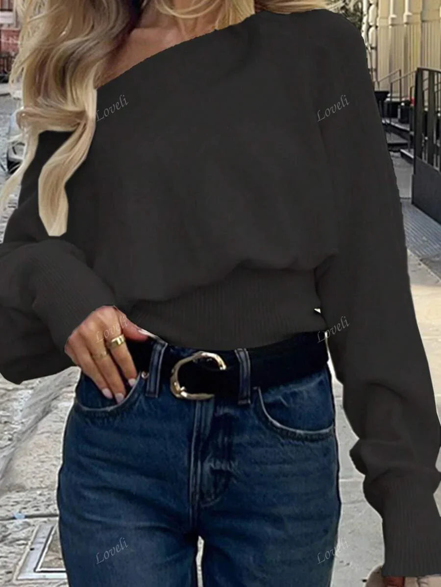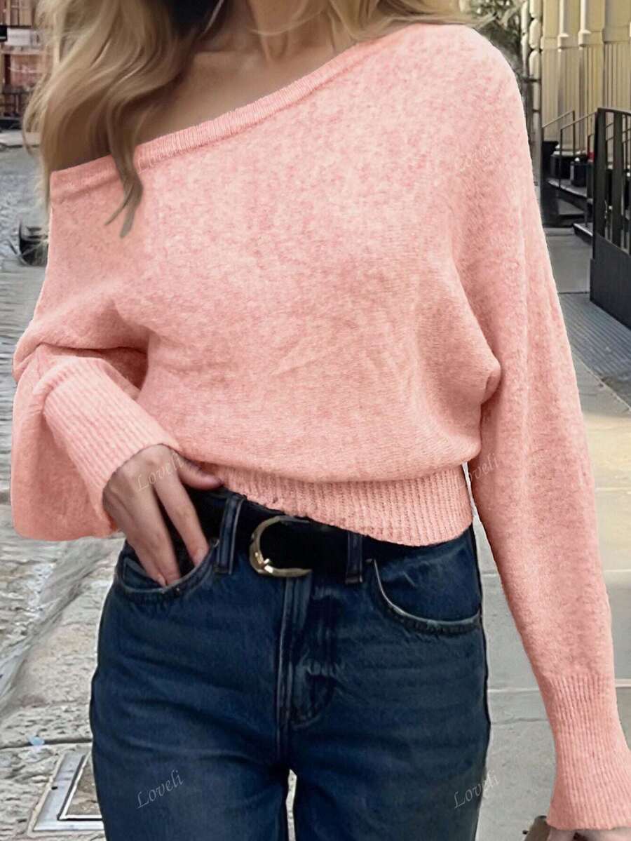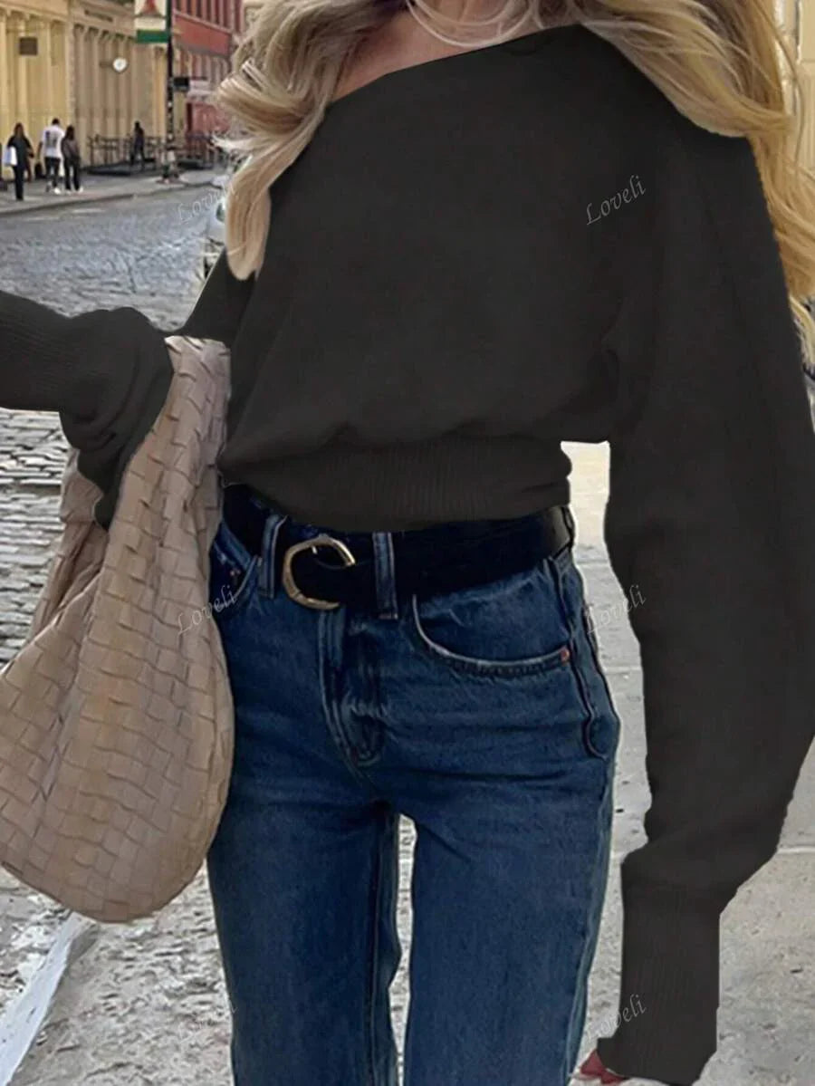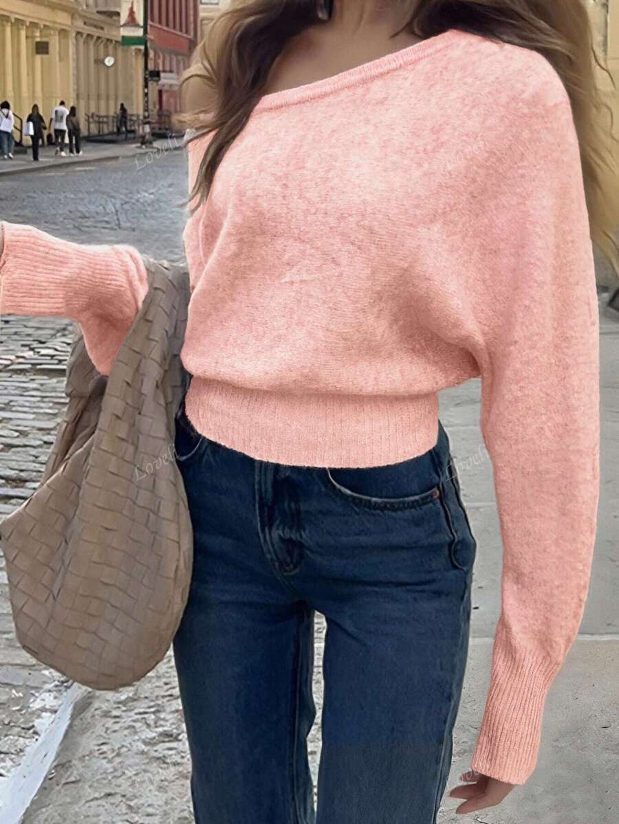 Maglione casual ed elegante da donna, a tinta unita, con spalle scoperte, maniche a pipistrello