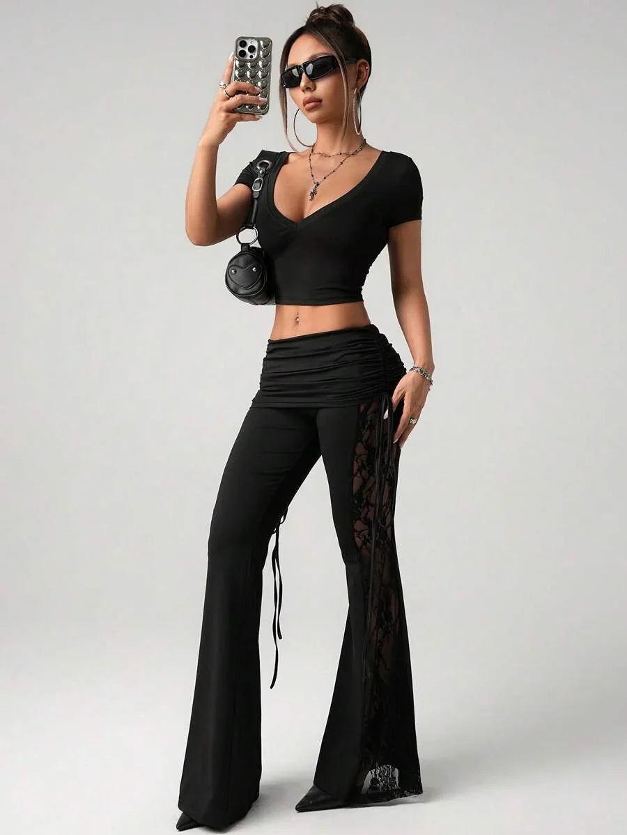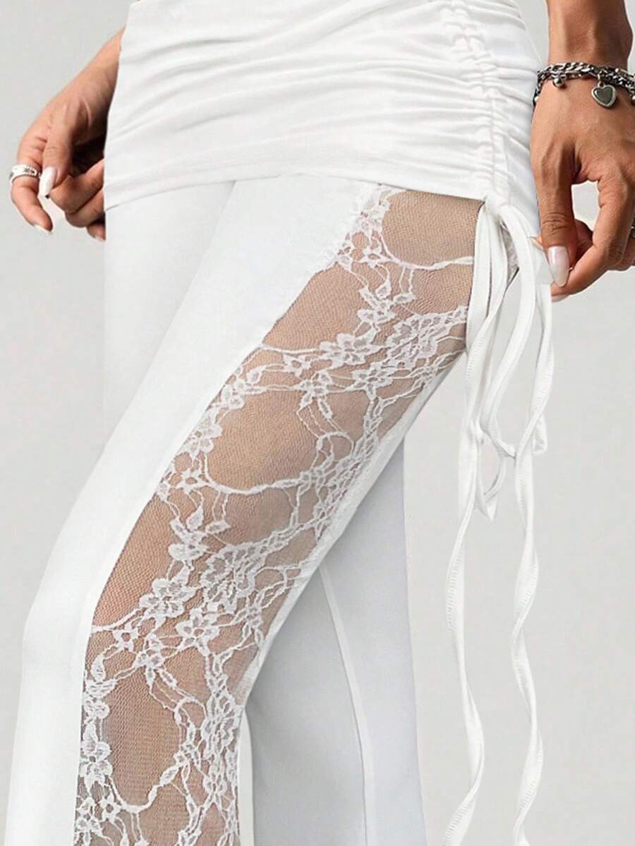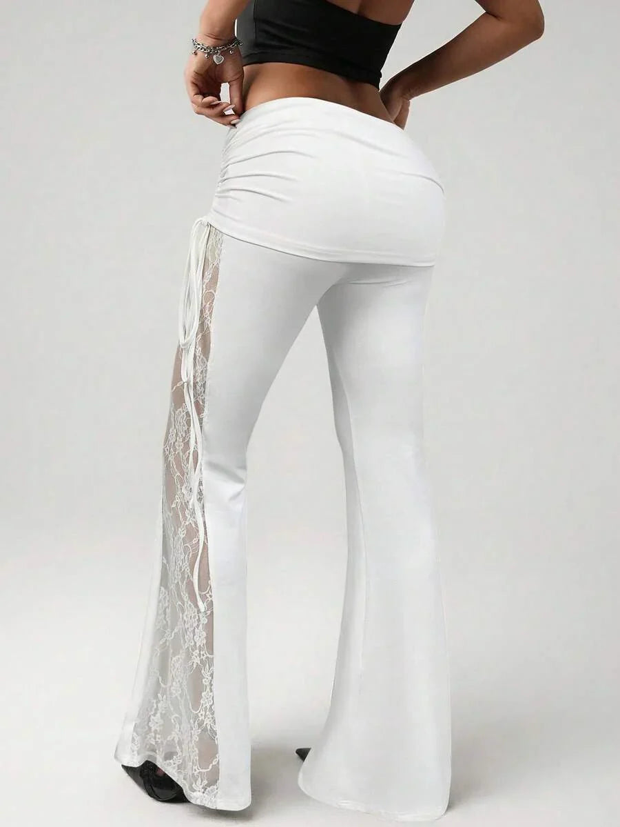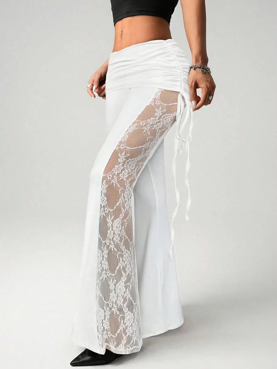 Pantaloni ampi da donna neri con pannelli in pizzo sui lati, con coulisse in vita e arricciature