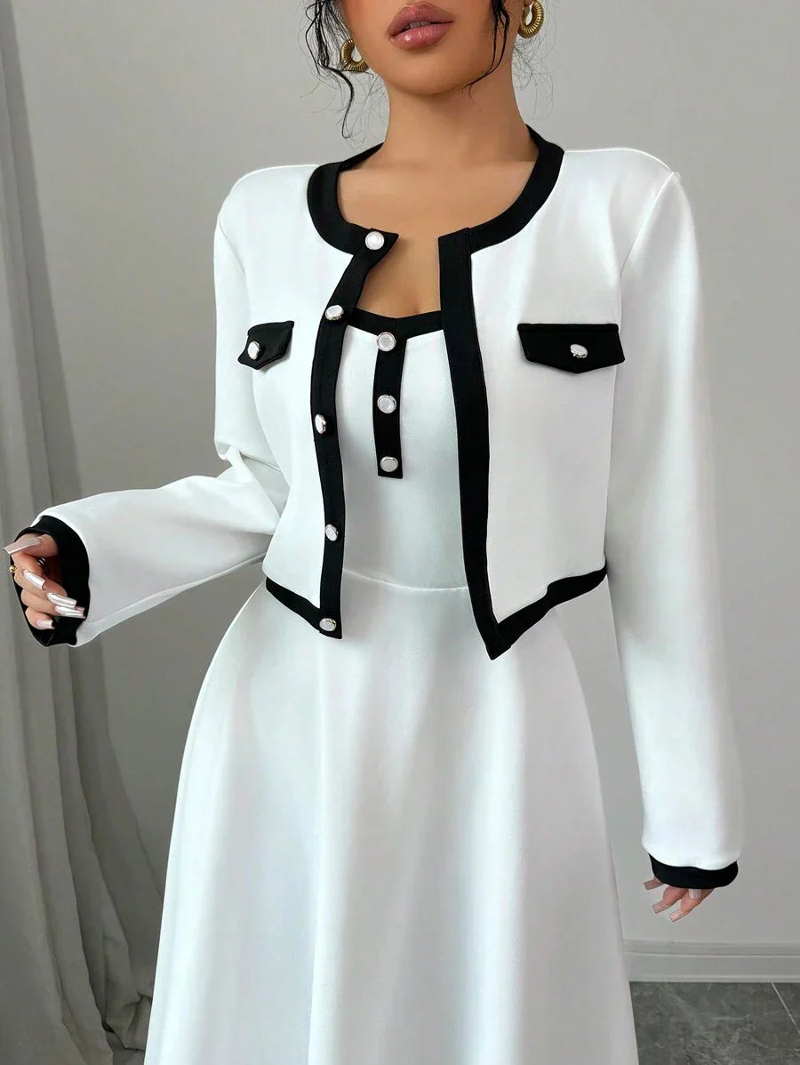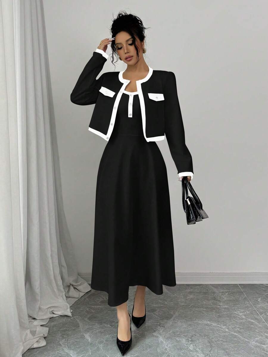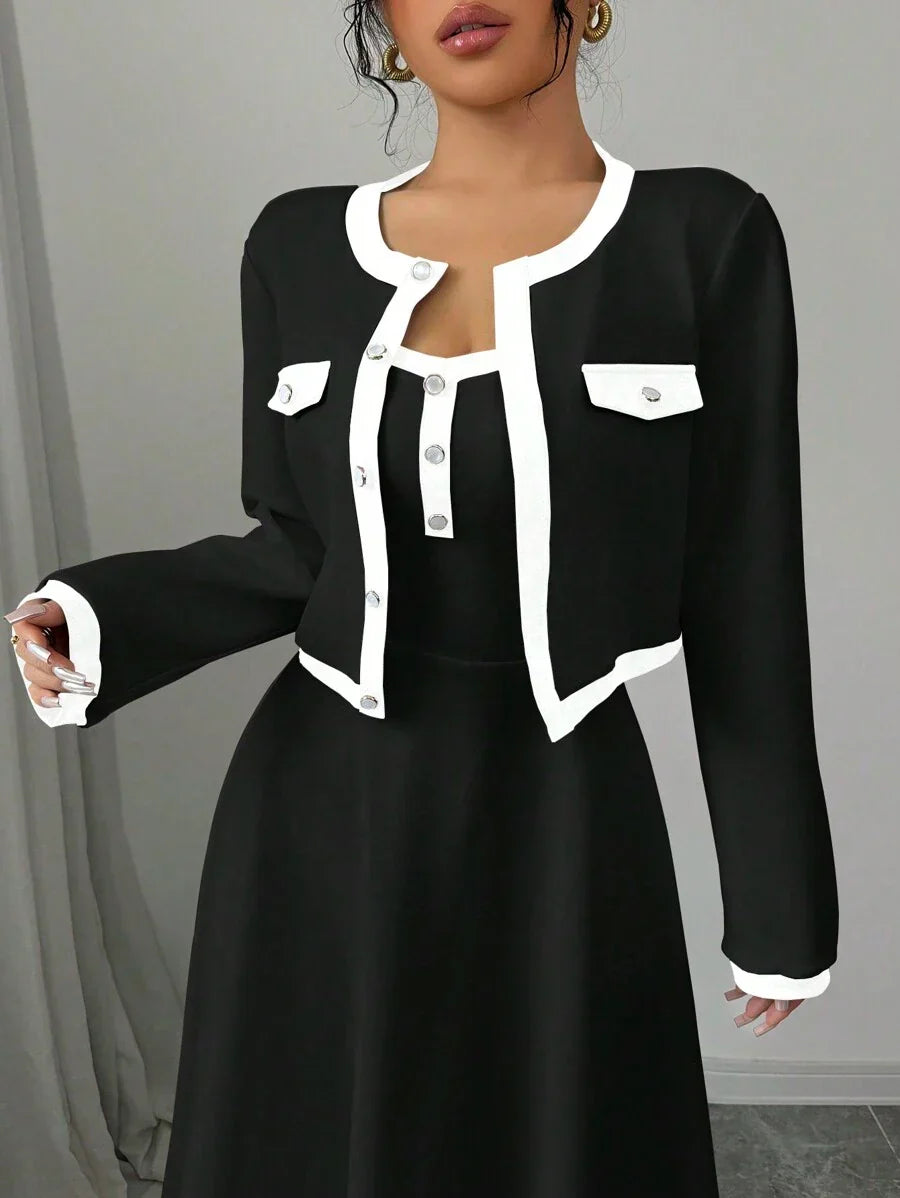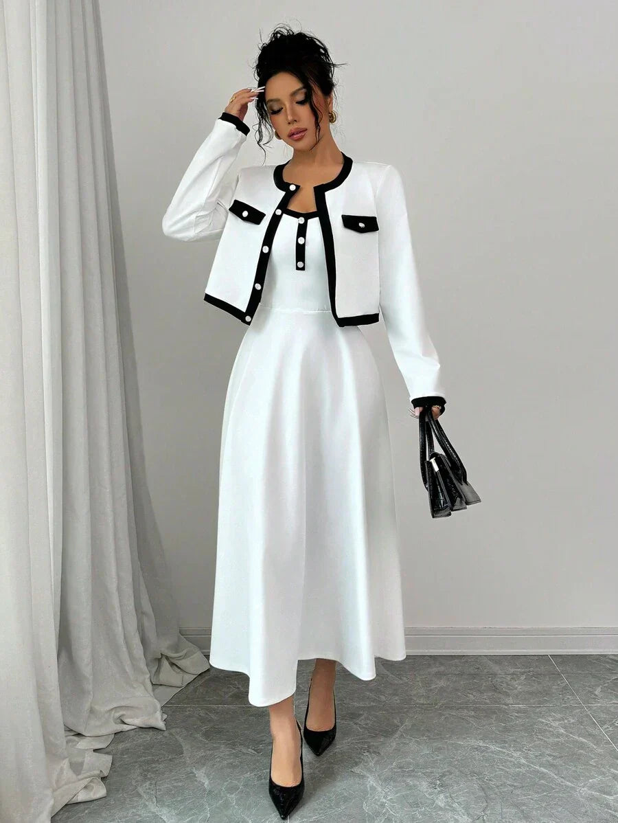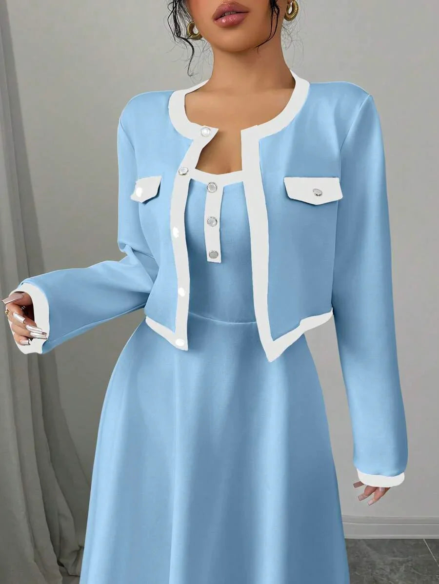 Set giacca e vestito donna con design a blocchi di colore, outfit elegante