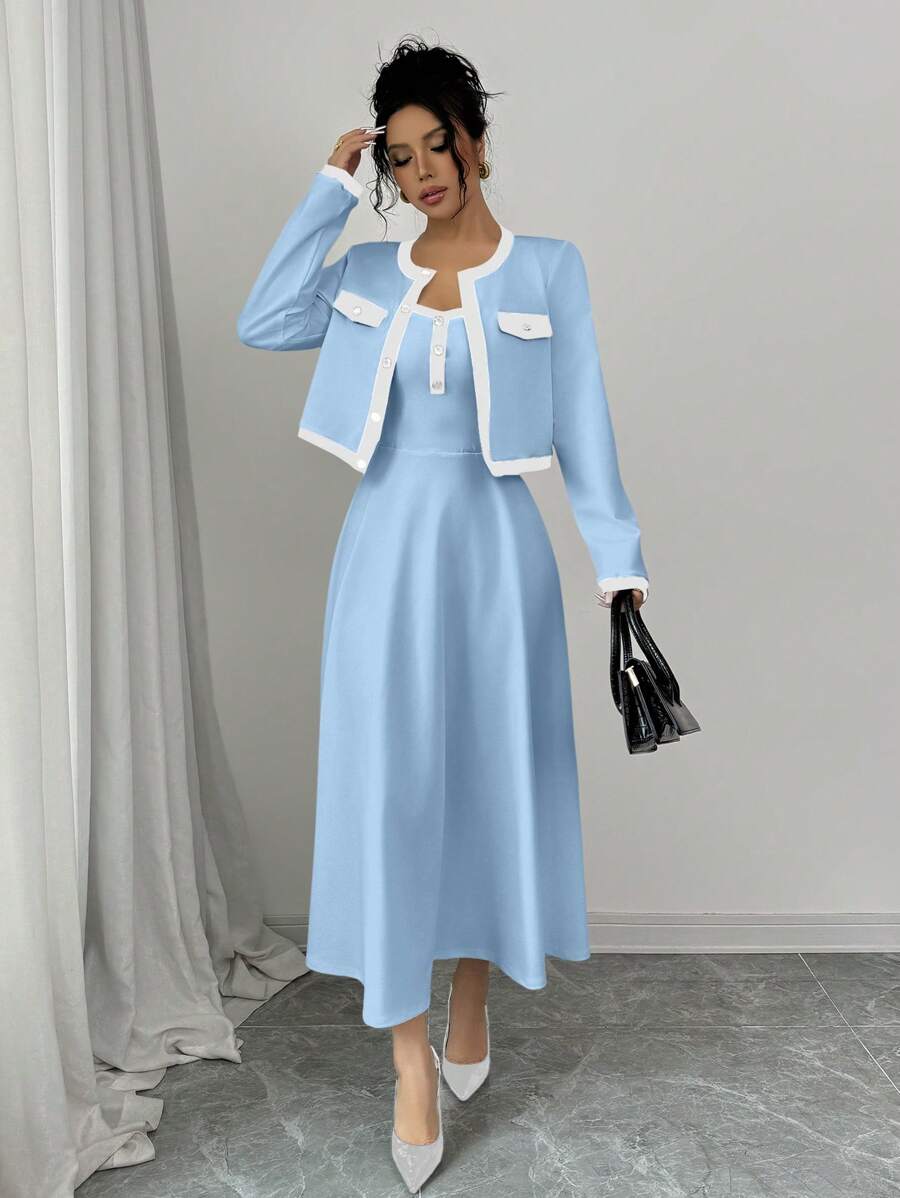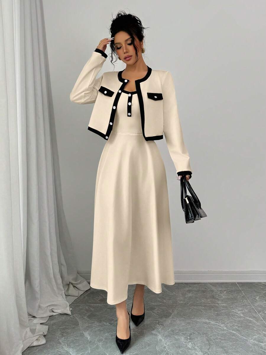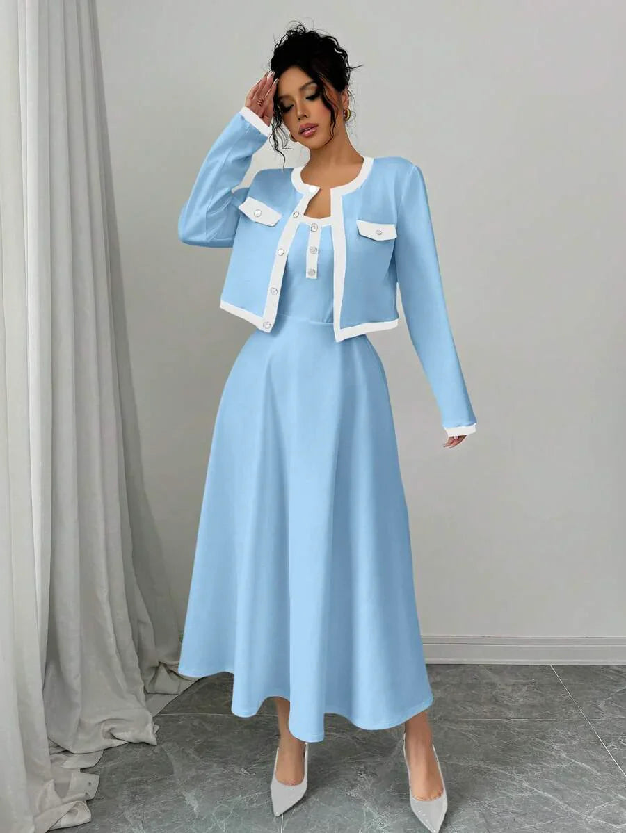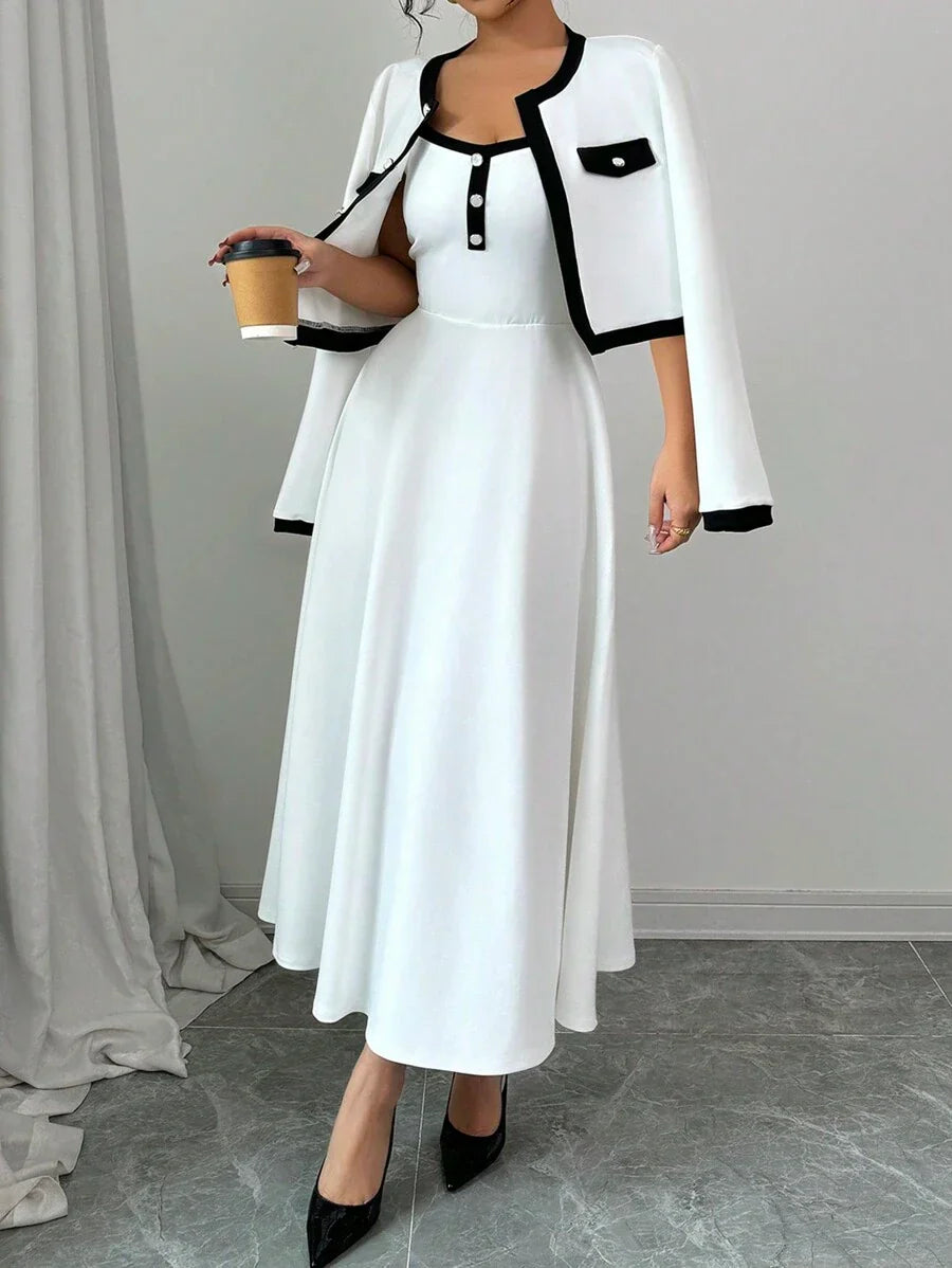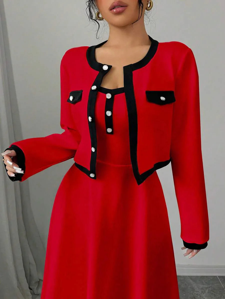 Set giacca e vestito donna con design a blocchi di colore, outfit elegante