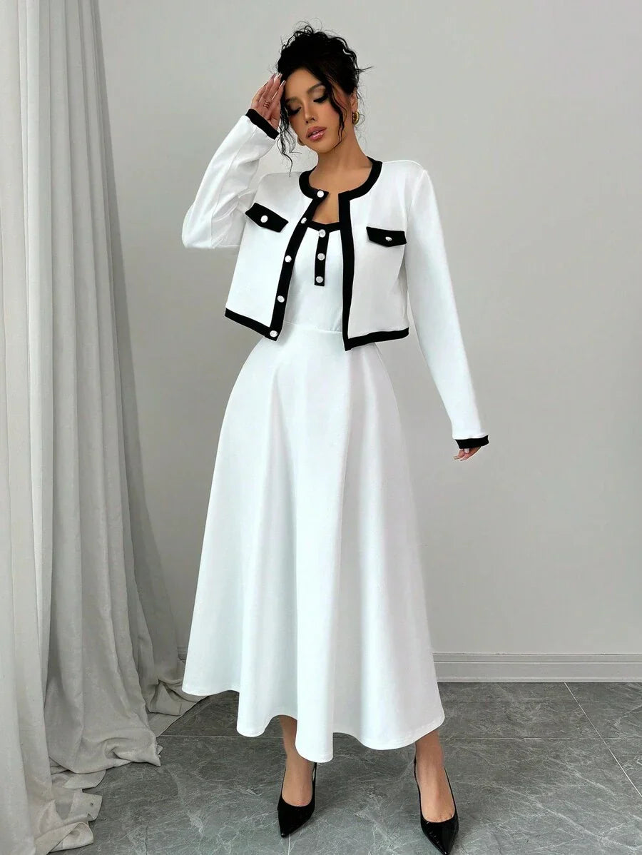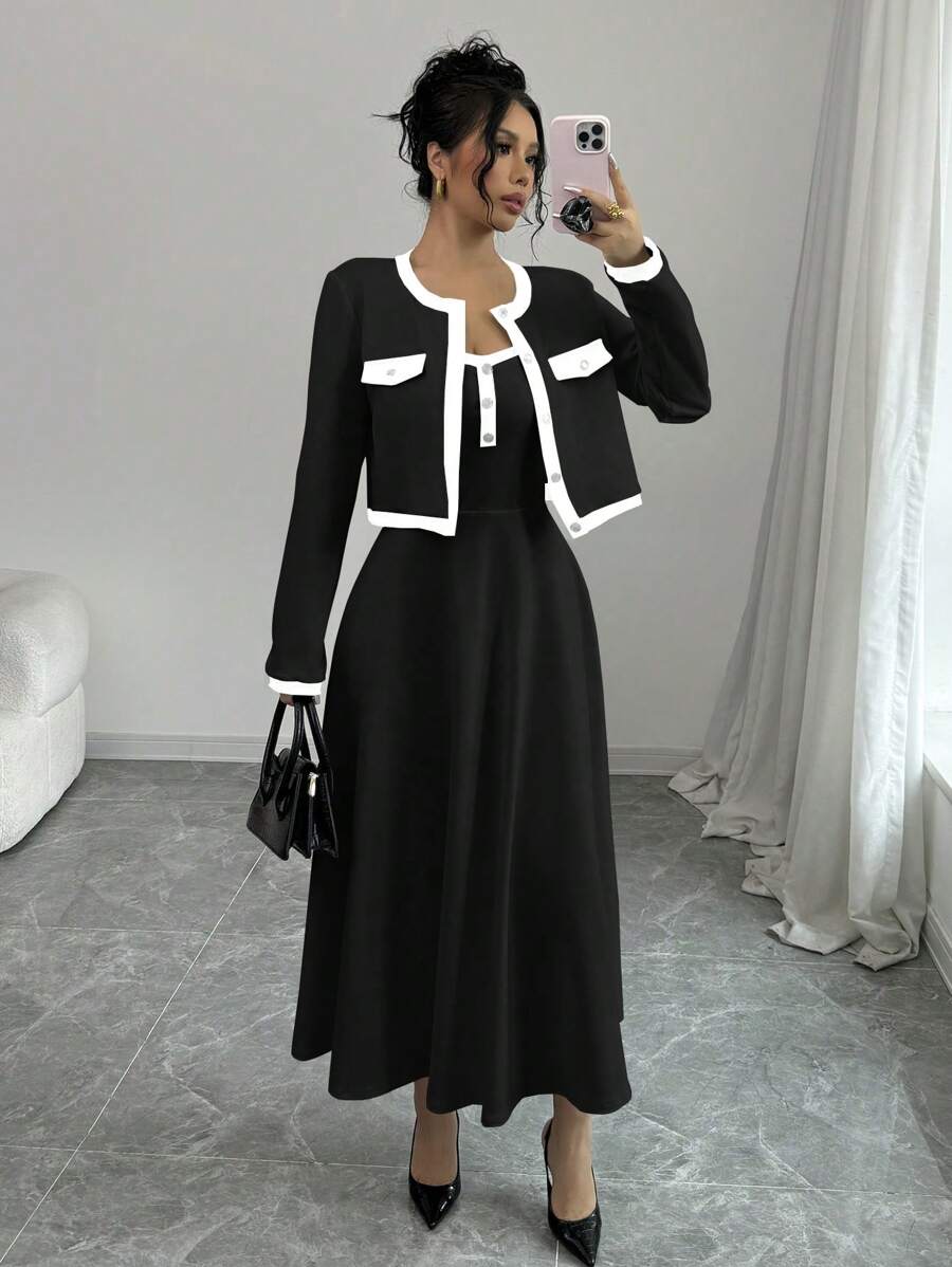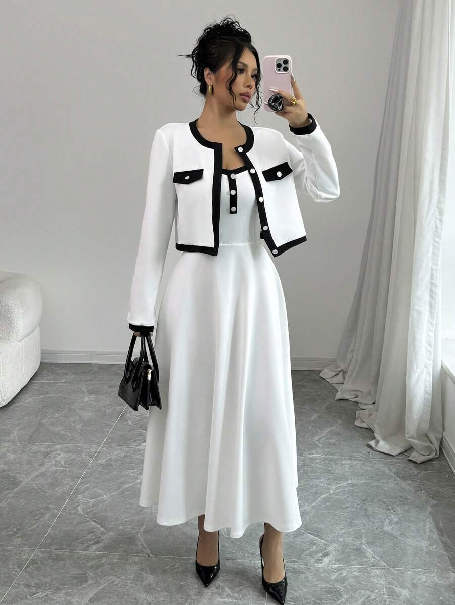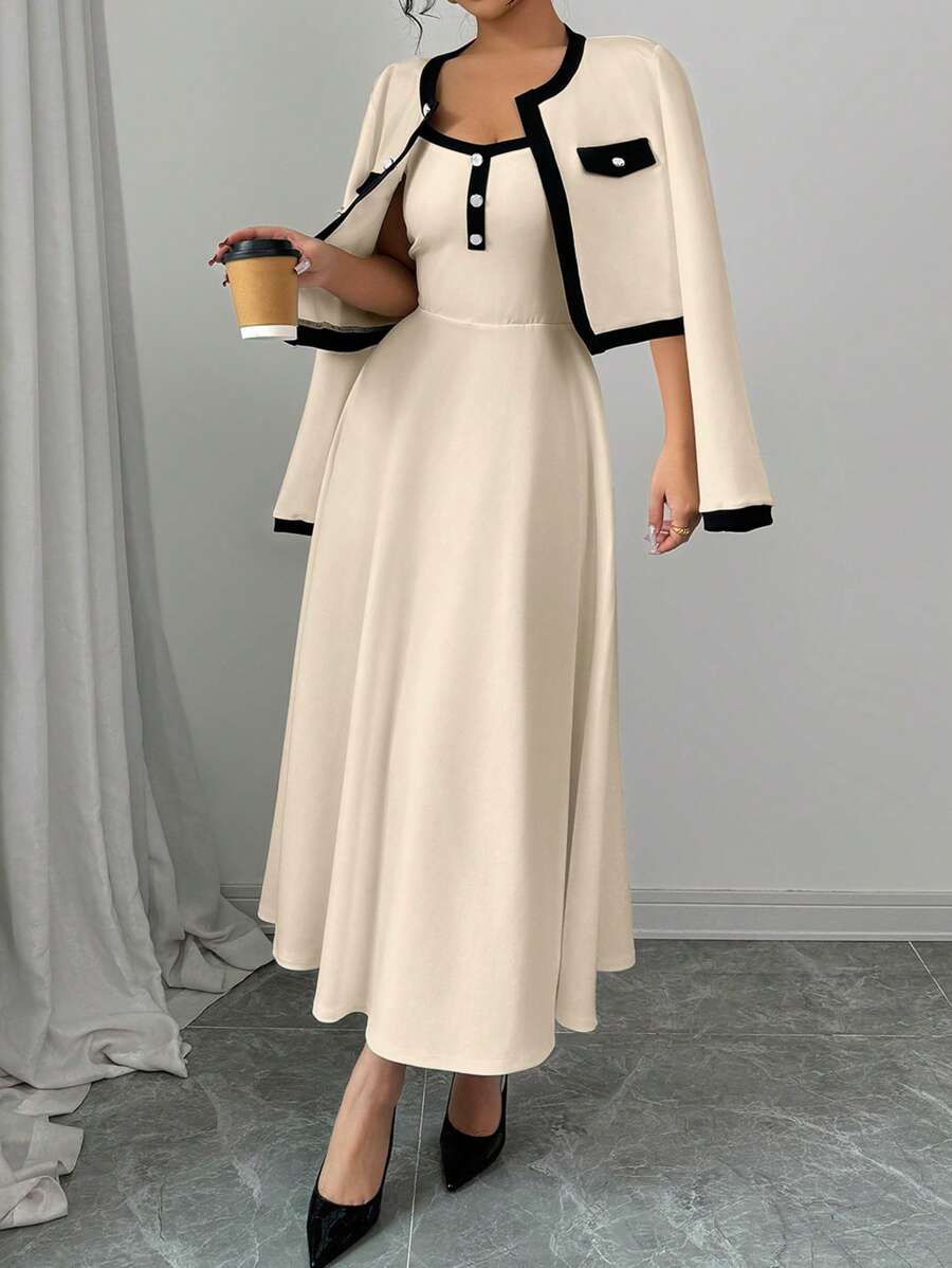 Set giacca e vestito donna con design a blocchi di colore, outfit elegante