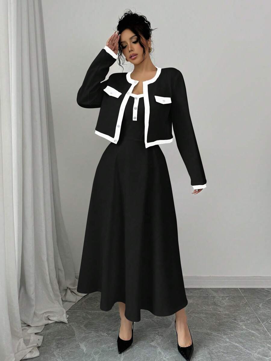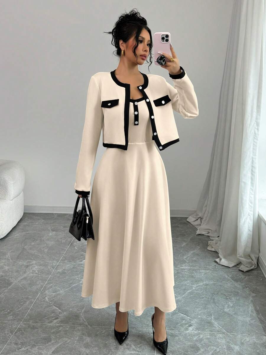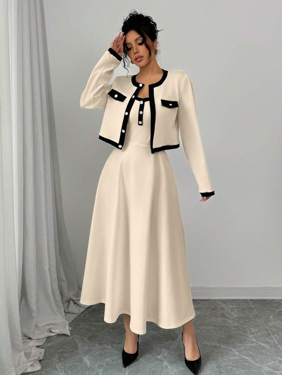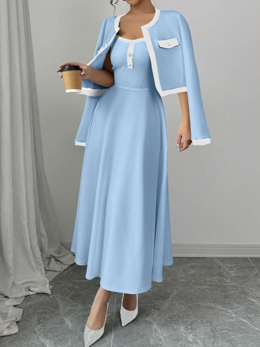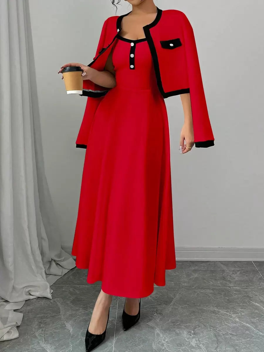 Set giacca e vestito donna con design a blocchi di colore, outfit elegante