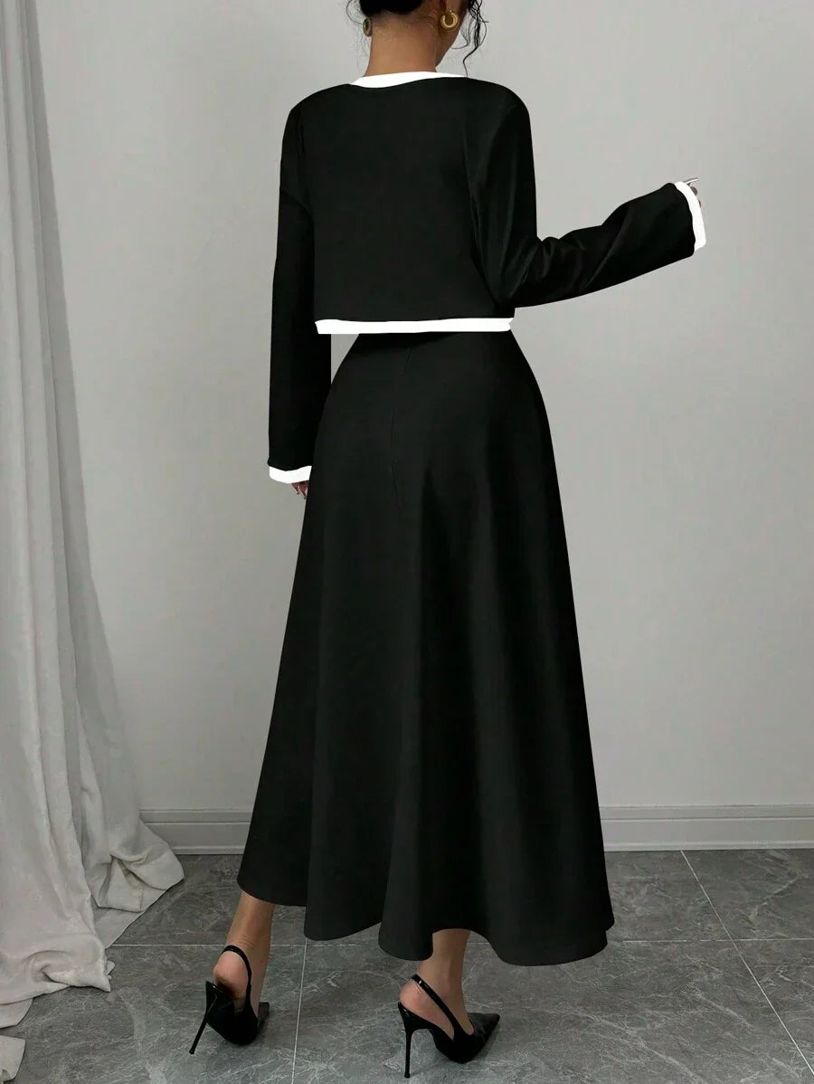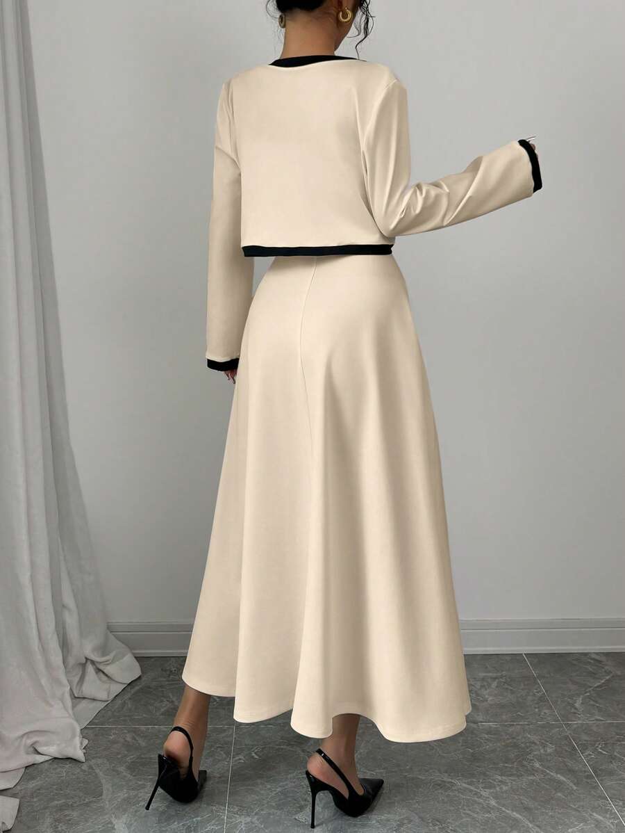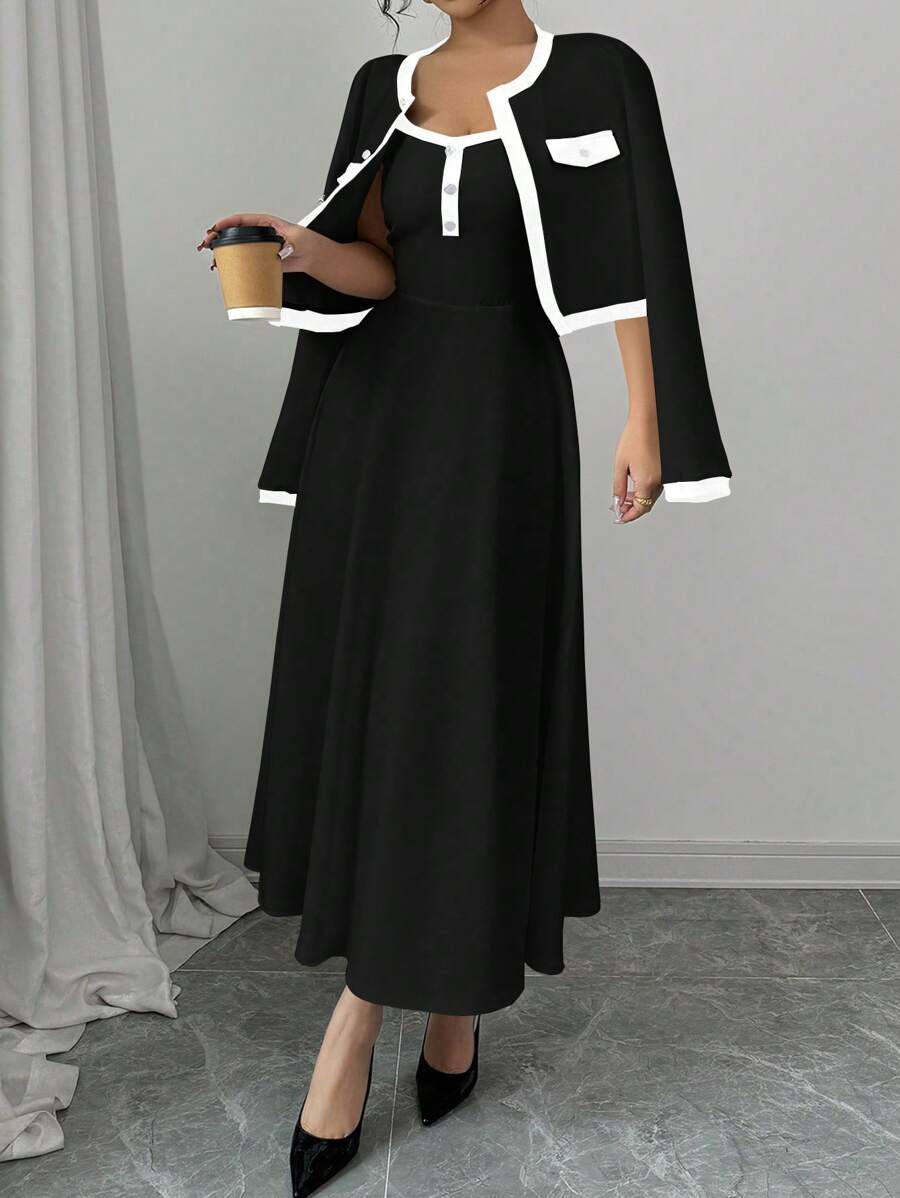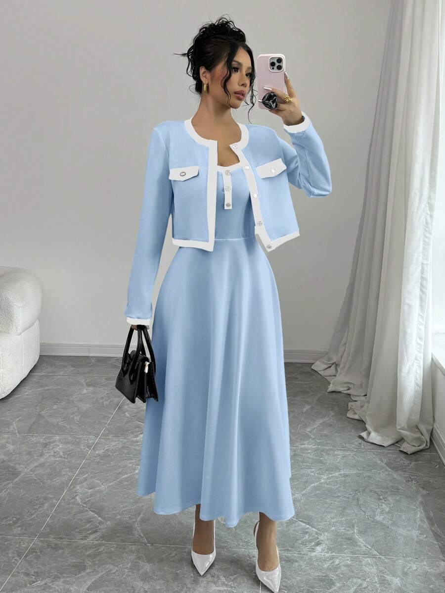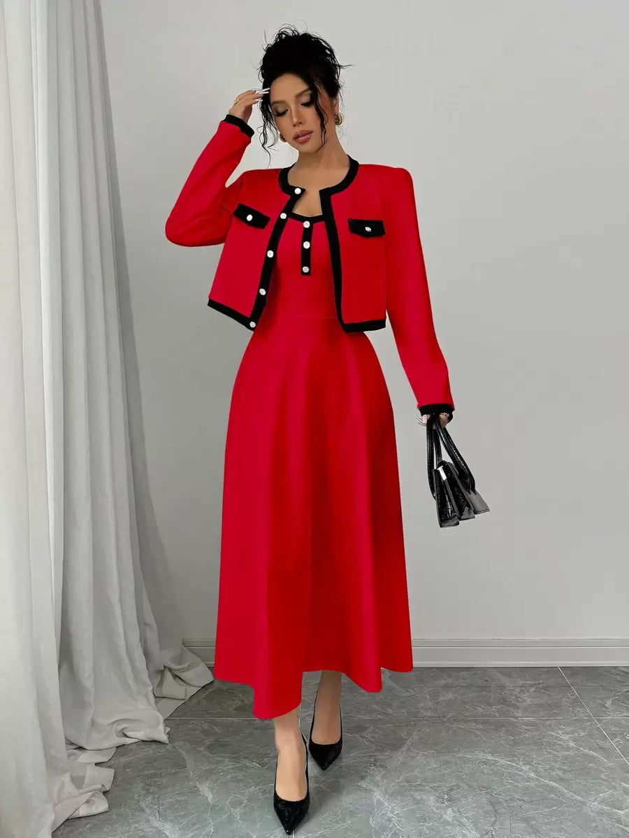 Set giacca e vestito donna con design a blocchi di colore, outfit elegante