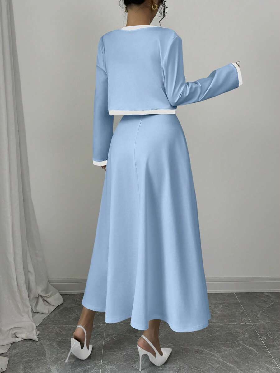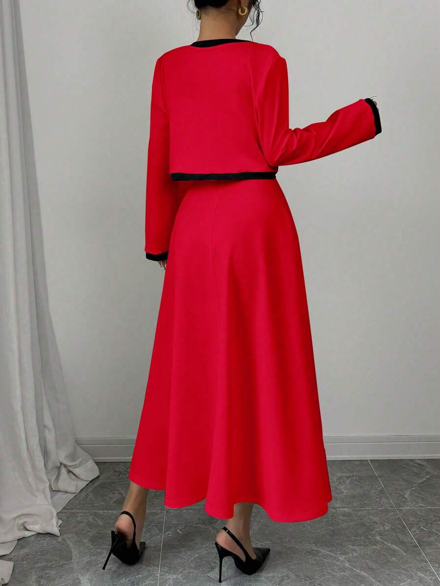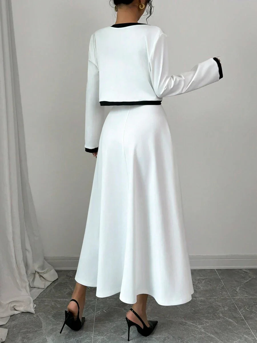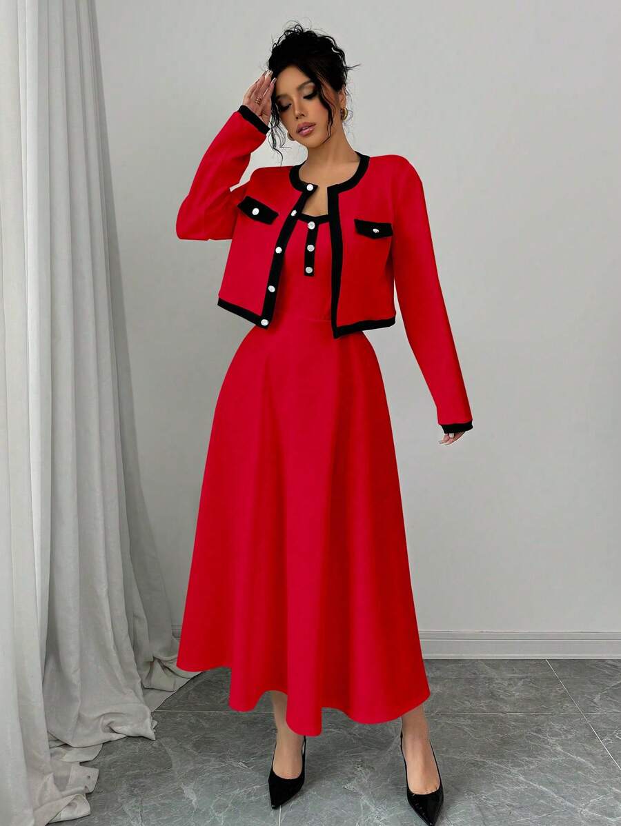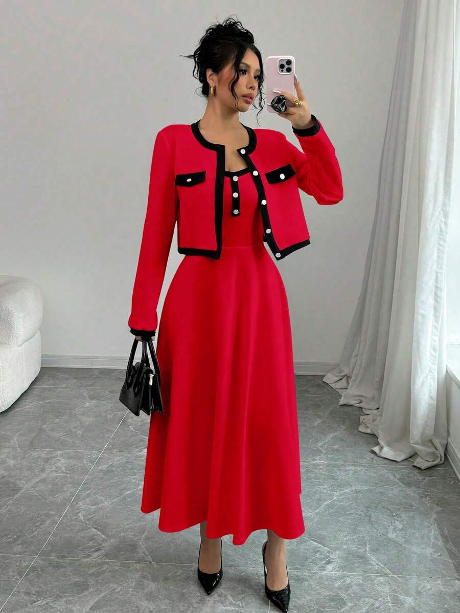 Set giacca e vestito donna con design a blocchi di colore, outfit elegante