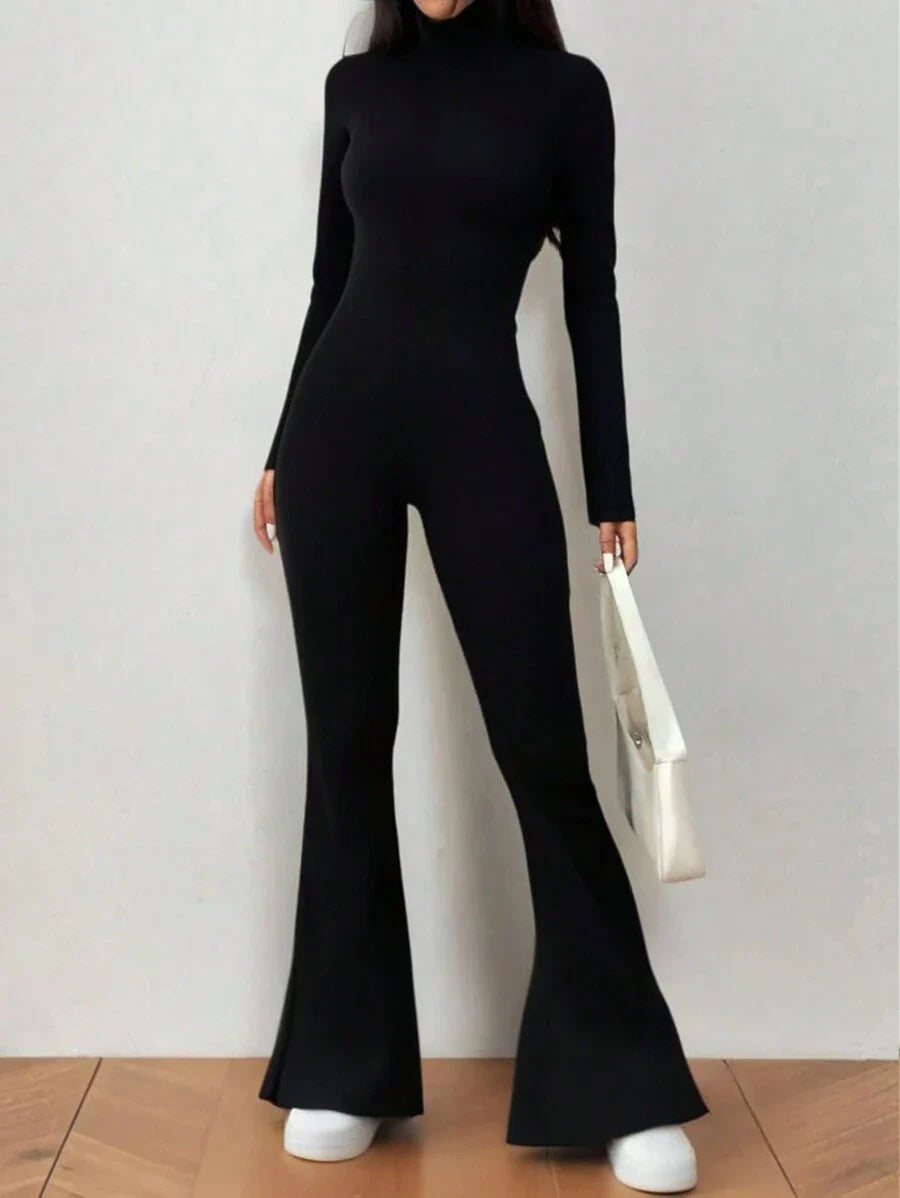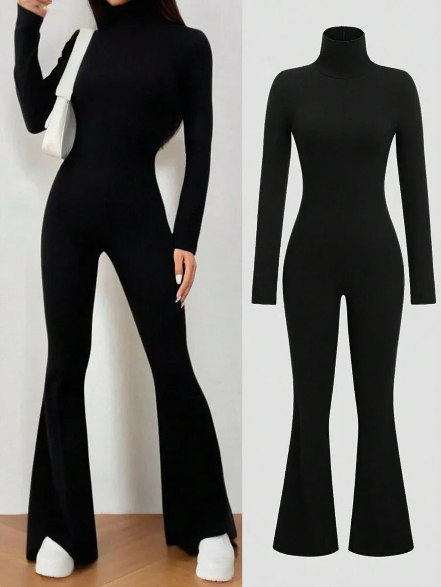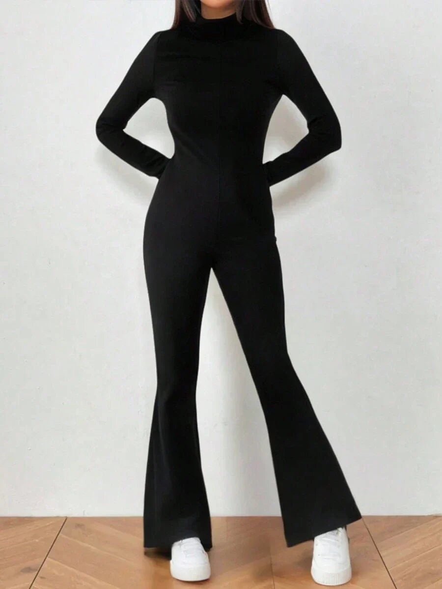Tuta jumpsuit nera aderente con collo alto, taglio e volant