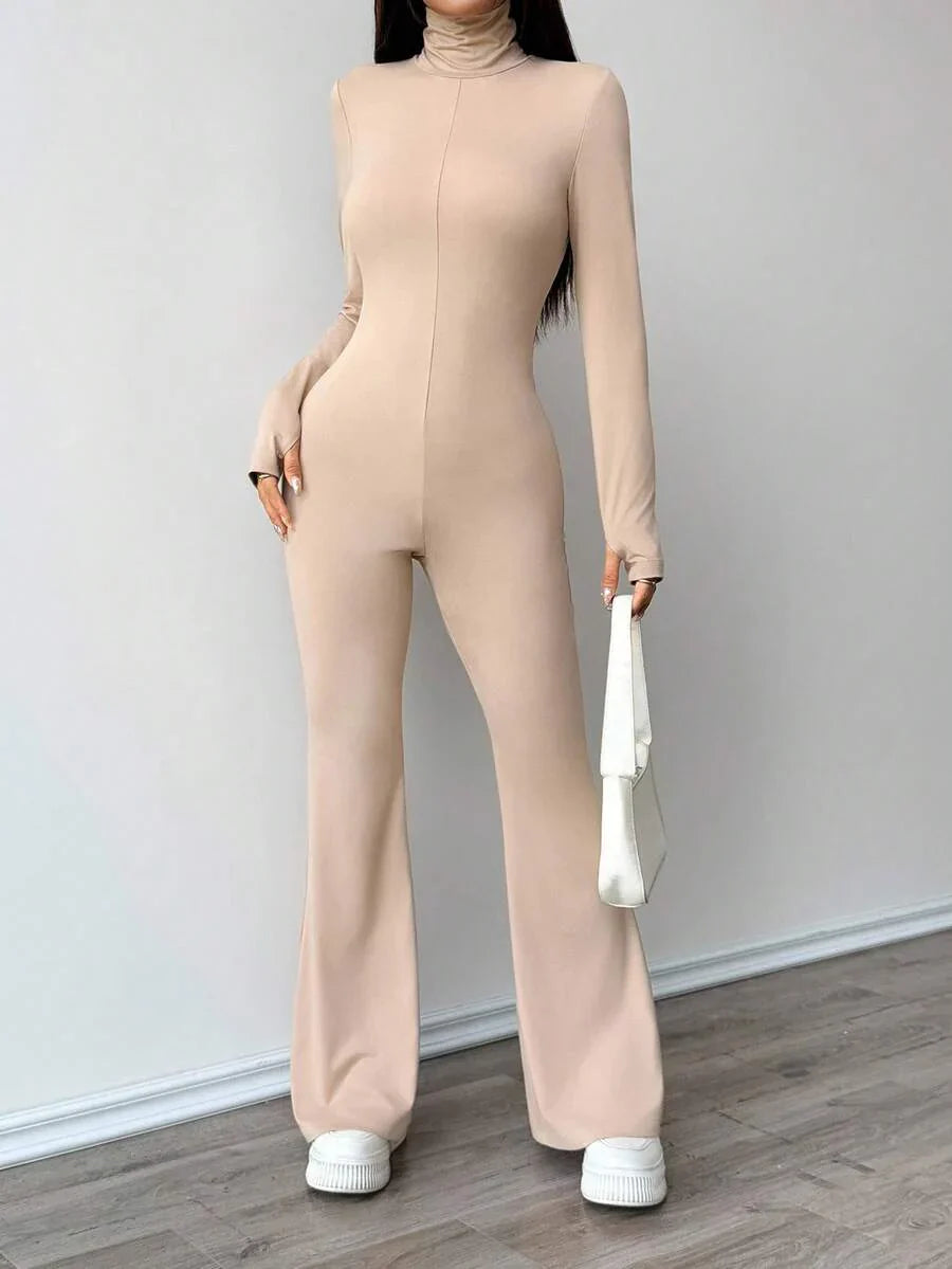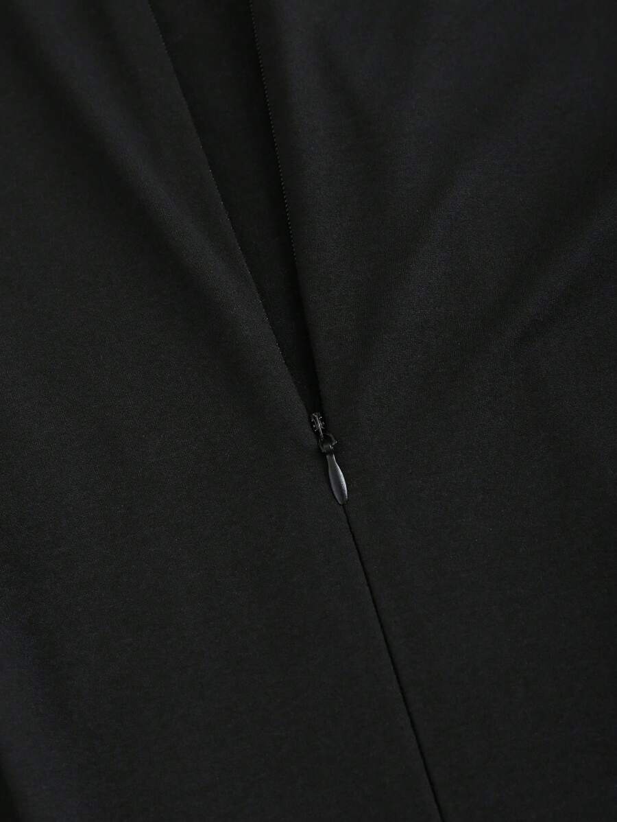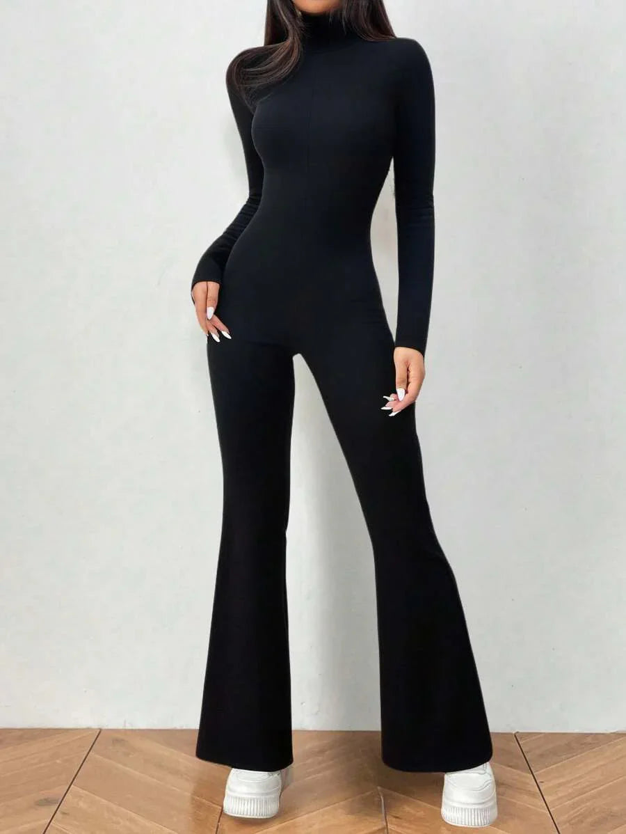 Tuta jumpsuit nera aderente con collo alto, taglio e volant